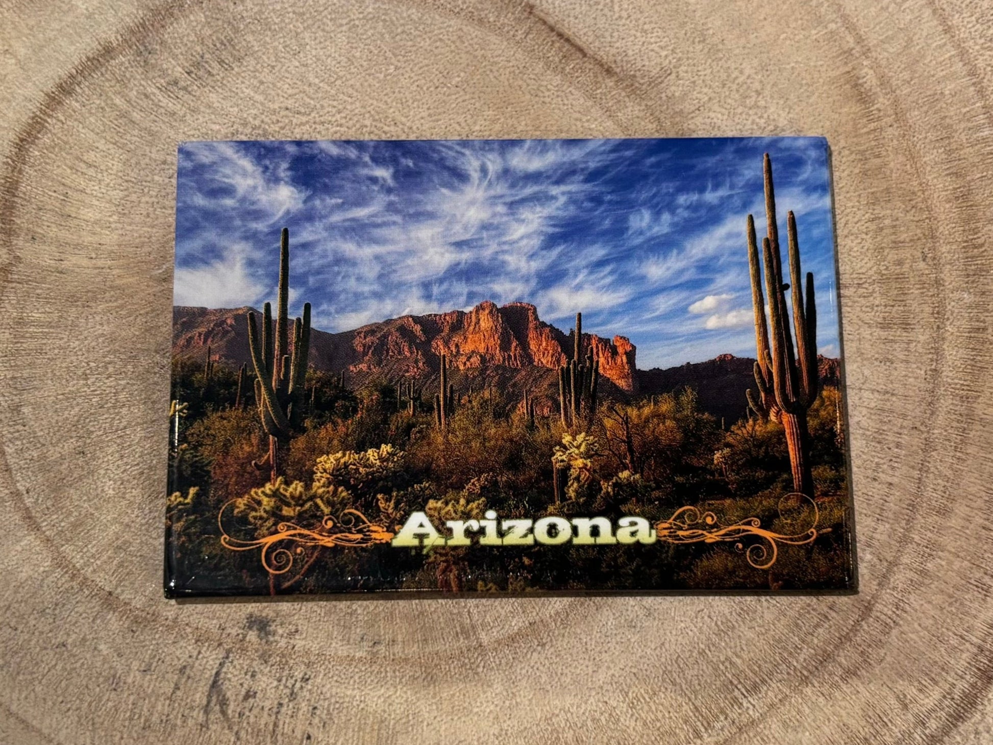 This magnet showcases the breathtaking red rock formations that Arizona is famous for capturing the rugged beauty. It highlights the towering and colorful layered rock against the bright blue sky. The awe-inspiring scenery is the perfect keepsake to always remember the beautiful Arizona landscape.