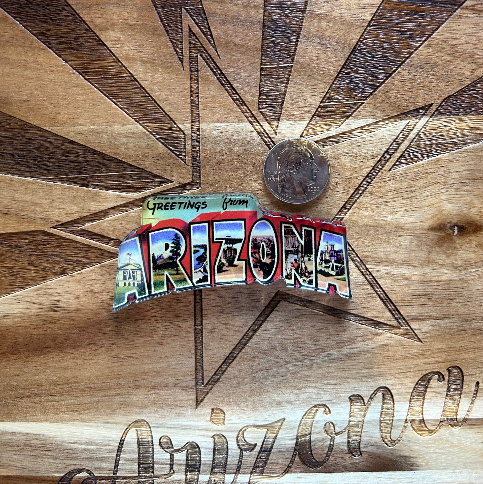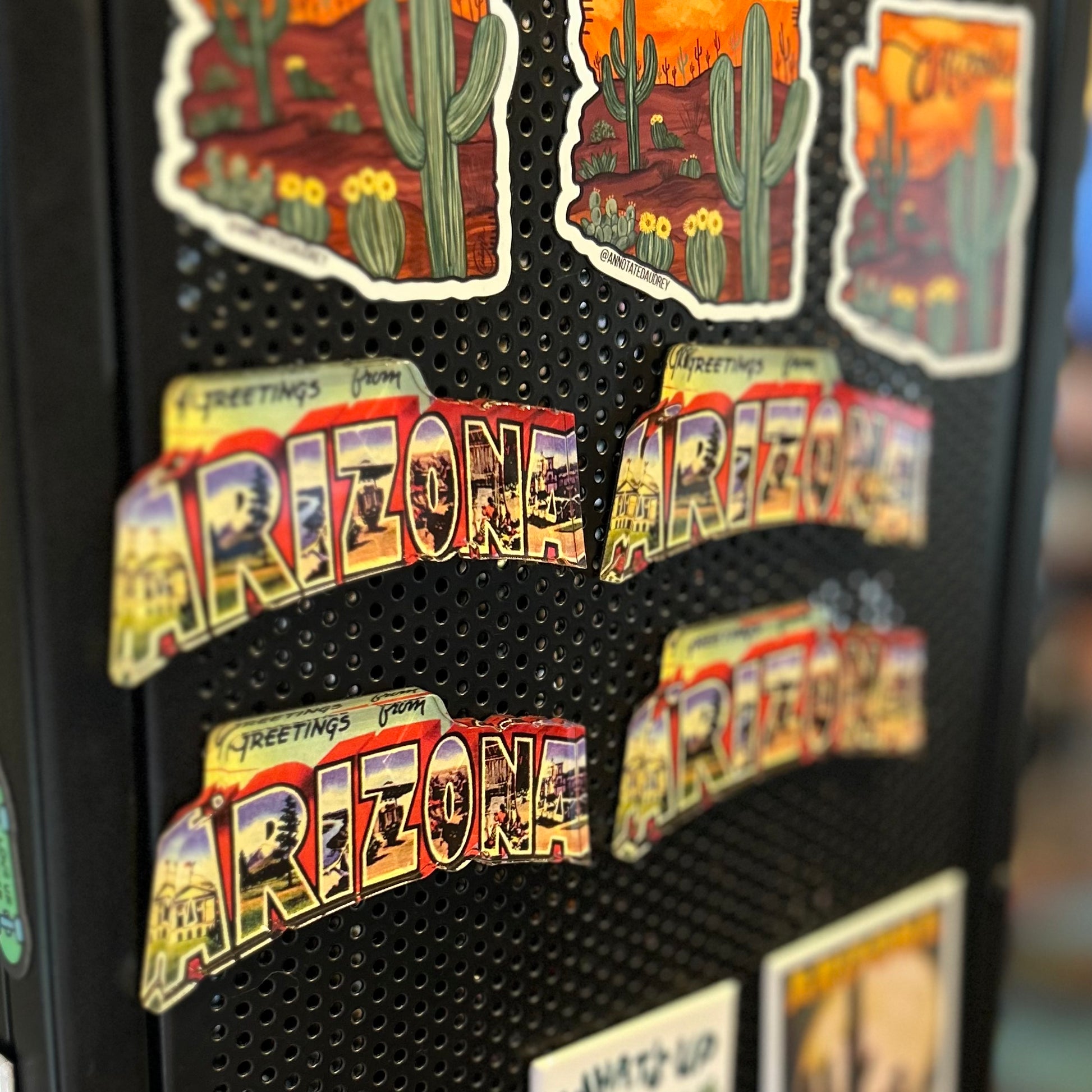 Celebrate Arizona in style with this unique acrylic magnet from the Arizona Retro Collection! The 1/4" thick acrylic is sturdy and bold, and the retro design is eye-catching and sure to stand out. Add some flavor to your refrigerator and show off your love of Arizona! These magnets feature 1/4” thick acrylic. Each one is printed with our durable ultra vivid process and are given a strong, 1” ceramic magnet applied to the back.