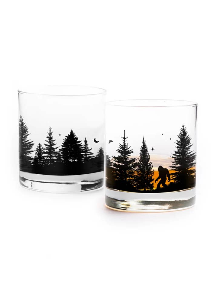 These bigfoot themed whiskey glasses showcase an original illustration that wraps around 4/5 of the glass and showcases a wandering squatch in a dense pine forest at night! These glasses are the perfect gift for any bigfoot enthusiast, or skeptic, and are sure to get a few comments regardless of where they are loved!
