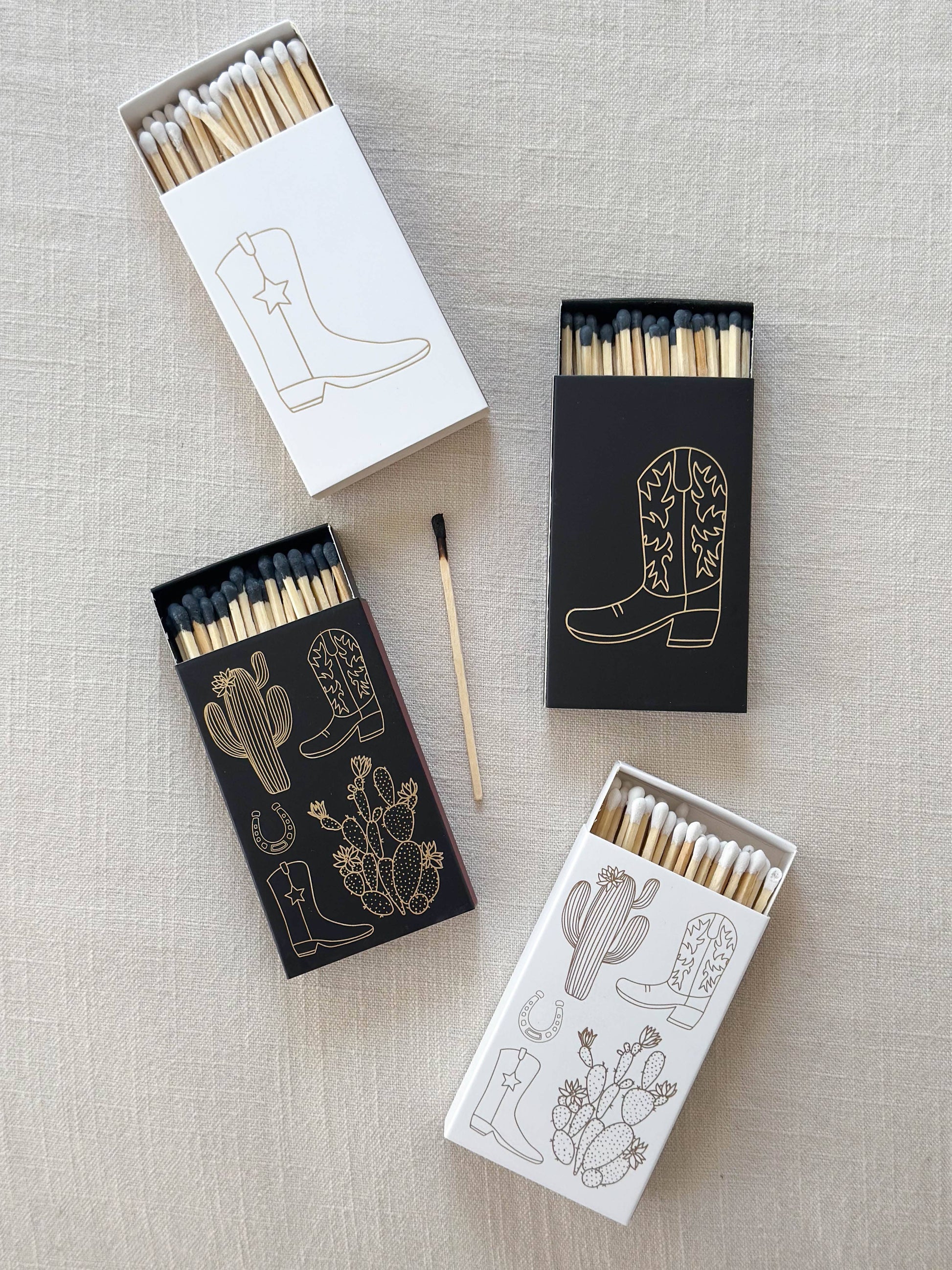 This playful Southwest design features hand drawn cowboy boots and cactuses printed on a black box with gold foil. Light up your favorite Stable Style candles with pretty safety matches. Or leave them on the coffee table to display. They are the perfect addition to the Stable Style collection. Each box contains approximately 50 matches Matches are 4 inches in length - Close box before striking matches - Strike matches gently away from body - Store in dry place Matches will only ship via ground services and may only be shipped within the United States.