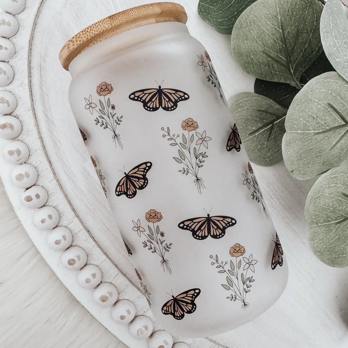 Bouquets & Butterfly 16oz Glass Cup with a Bamboo Lid!