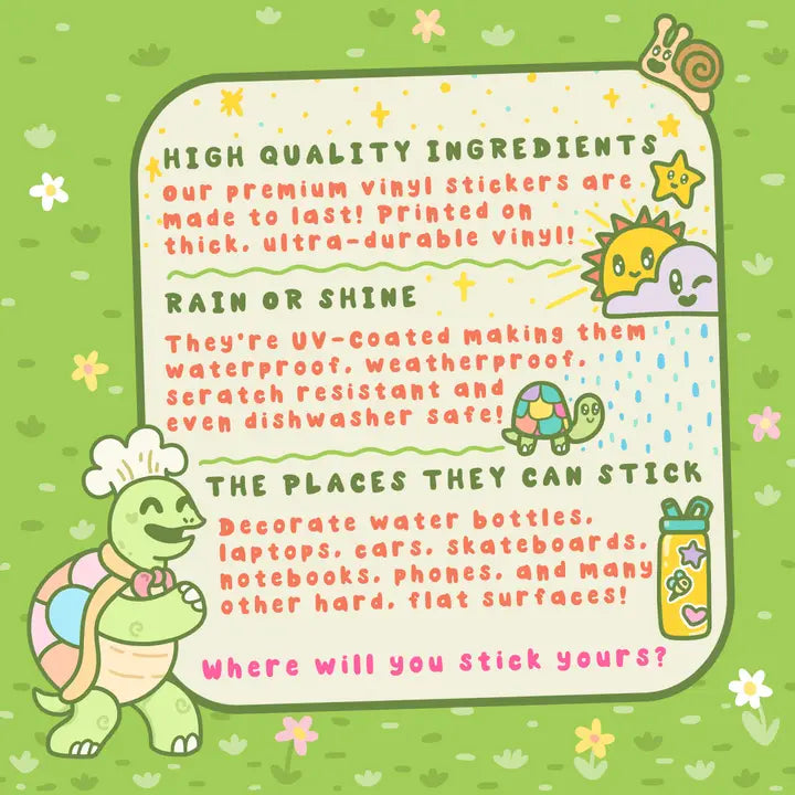 🐢 Our Turtley Awesome vinyl stickers are made from the highest quality ingredients on the market! Printed on thick, ultra durable vinyl, these stickers are made to last. They're UV-coated making them waterproof, weatherproof, and dishwasher safe!