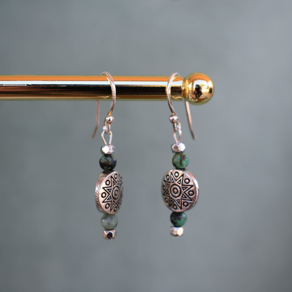 these earrings feature a delicate sun design with african turquoise accent beads. add a subtle splash of blue to any outfit and take a little piece of the desert with you!