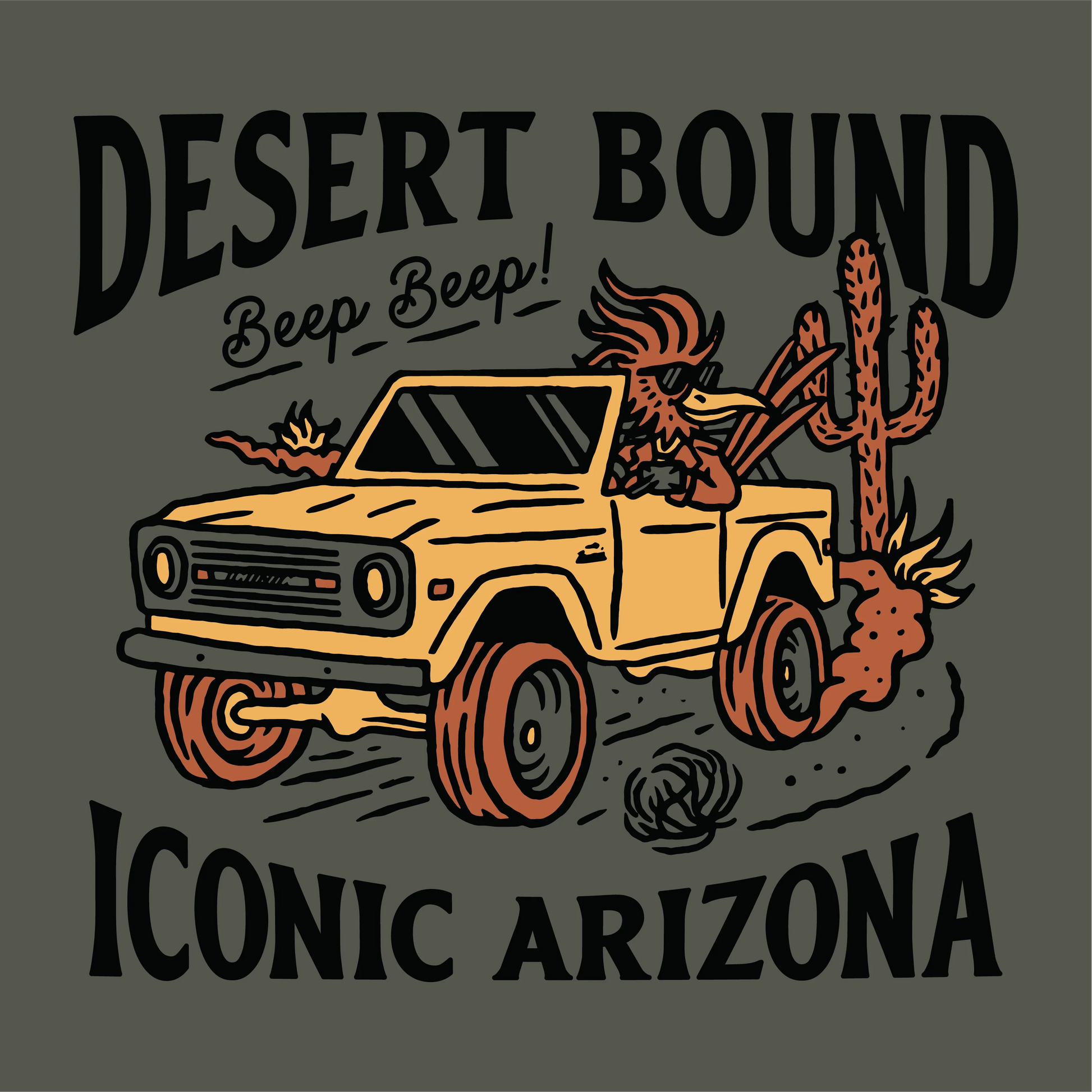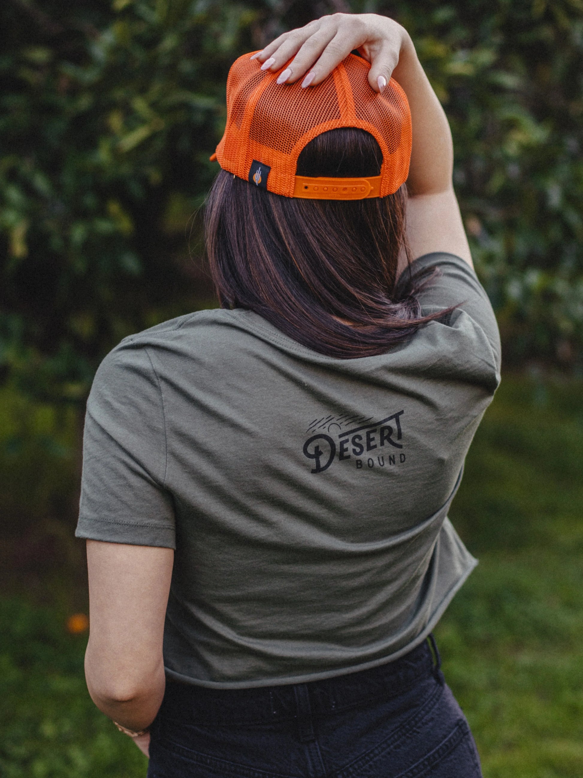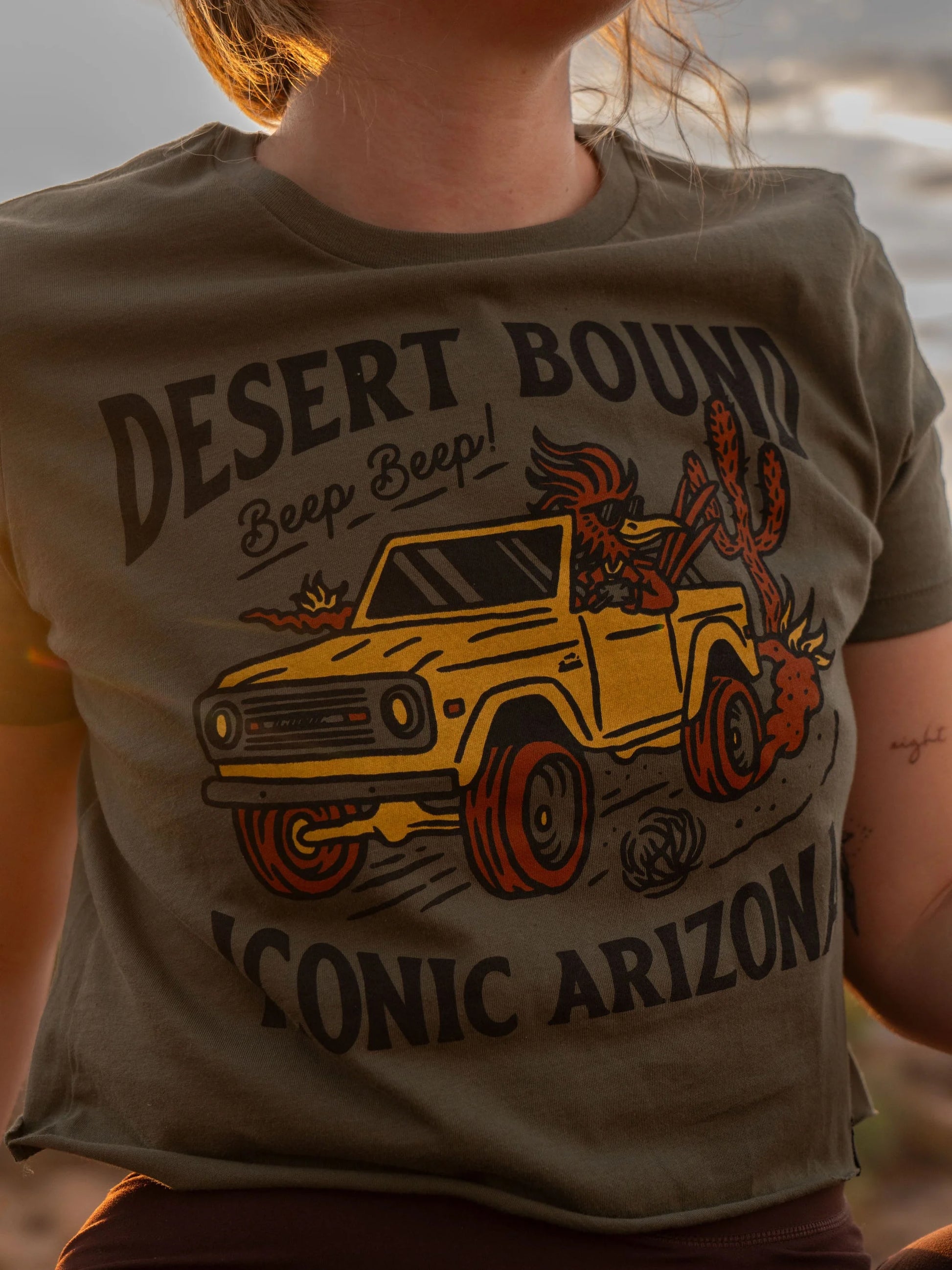 Stay stylishly adventurous in this Desert Bound Crop Tee! It's a vintage-vibed, military green tee with the iconic road runner and jeep, perfect for kickin' it back on your weekend excursions. Pair it with some cutoffs and get ready to explore! Beep-beep!