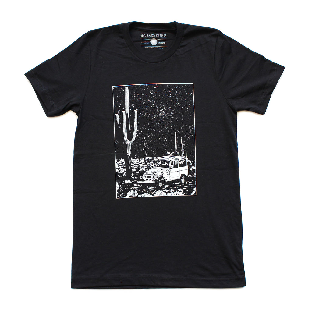 Our Desert Cruiser Tee in black is a screen-printed t-shirt with white ink. With a retail fit, this incredibly soft t-shirt is made out of 100% Airlume combed and ring-spun cotton. Our soft t-shirts are unisex in wear.