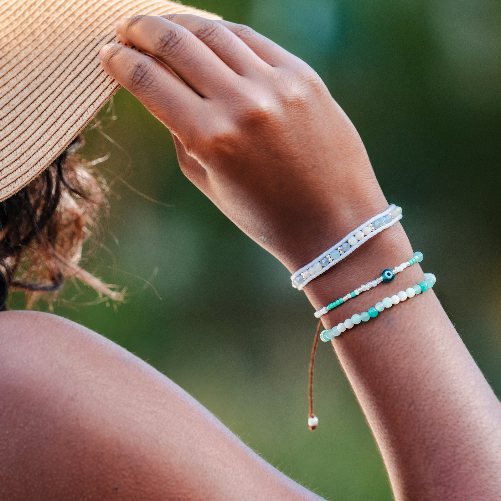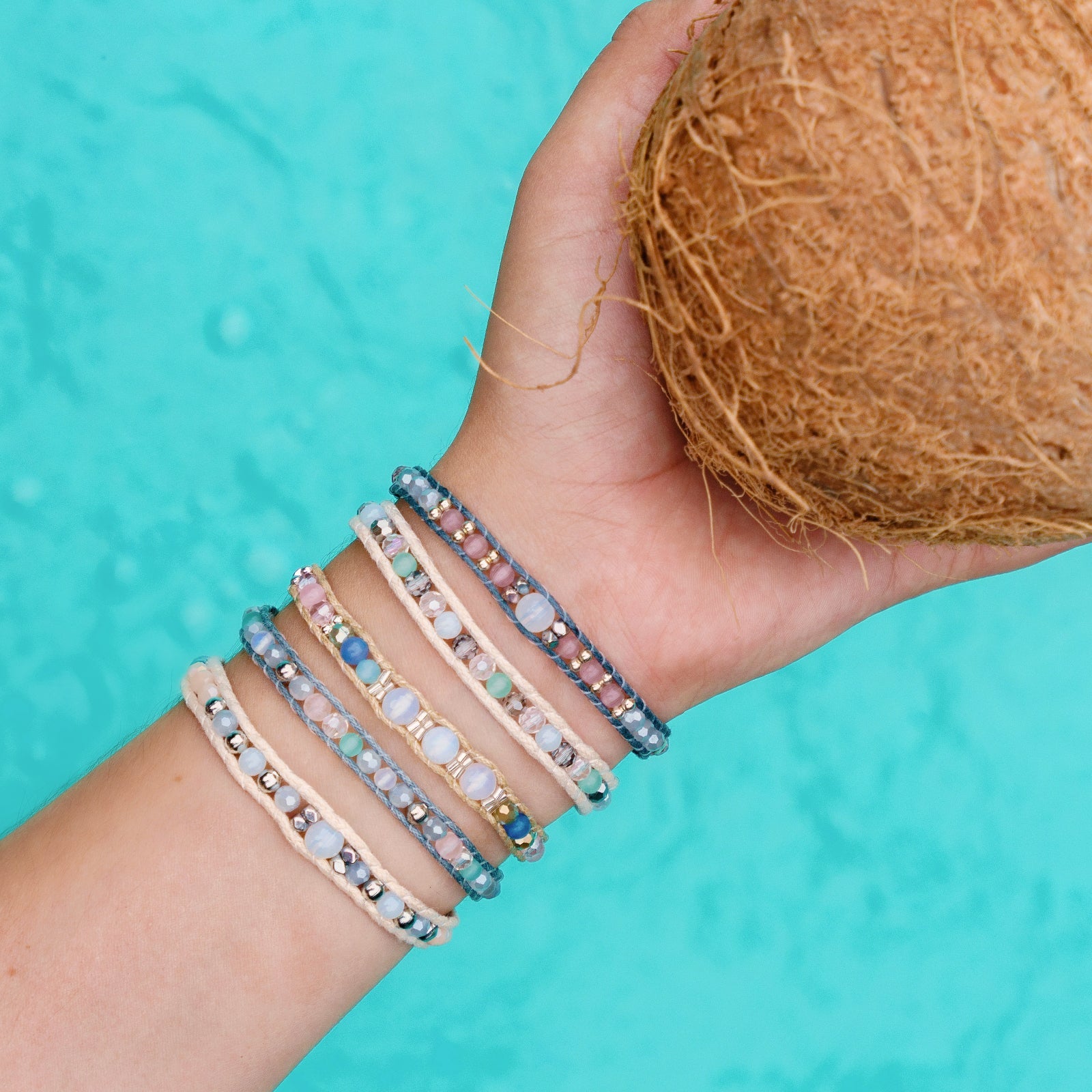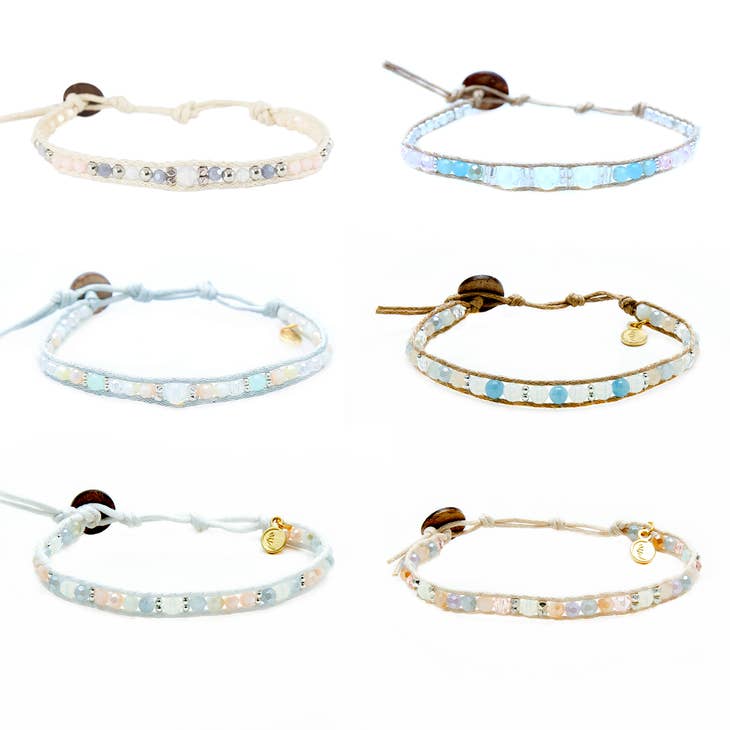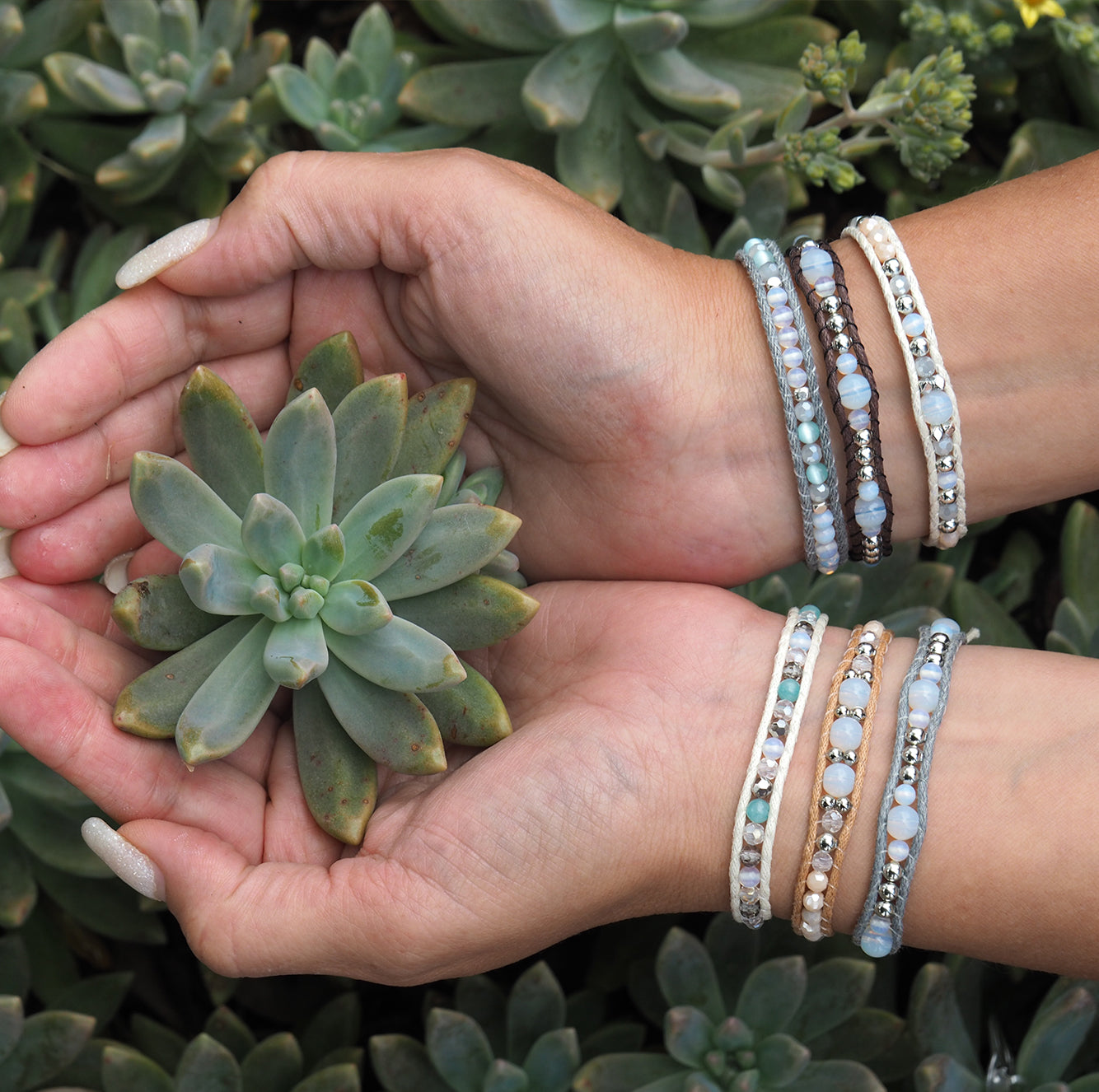 Inspired by the power and beauty of the moon, the Moonbeam collection offers moonstone in every piece. Known to heighten intuition and ease stress, everyone needs a little moonstone in their life! Please note that, due to their handcrafted nature, each bracelet is unique and may have slight variations.