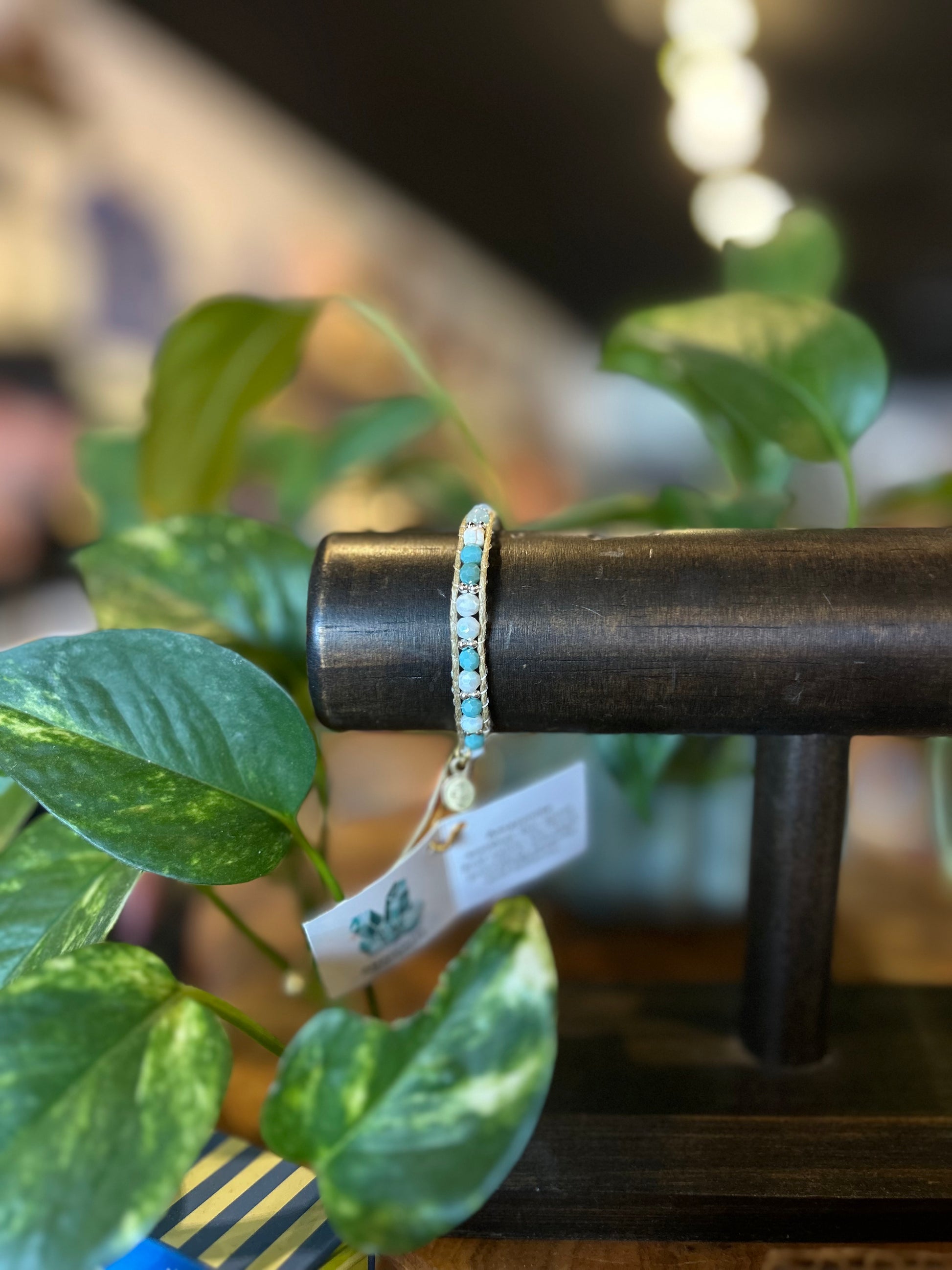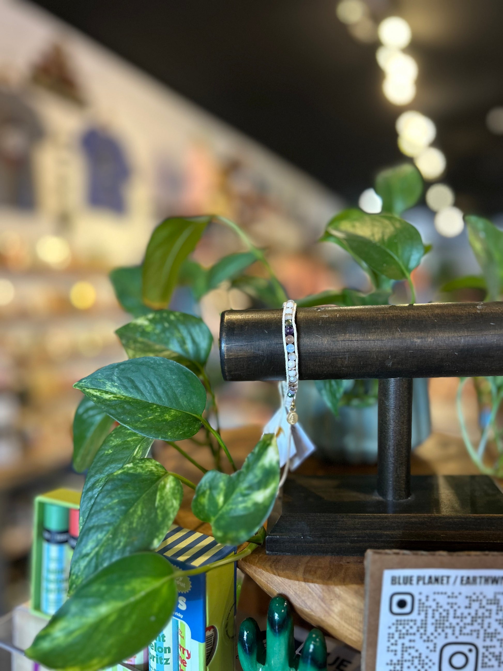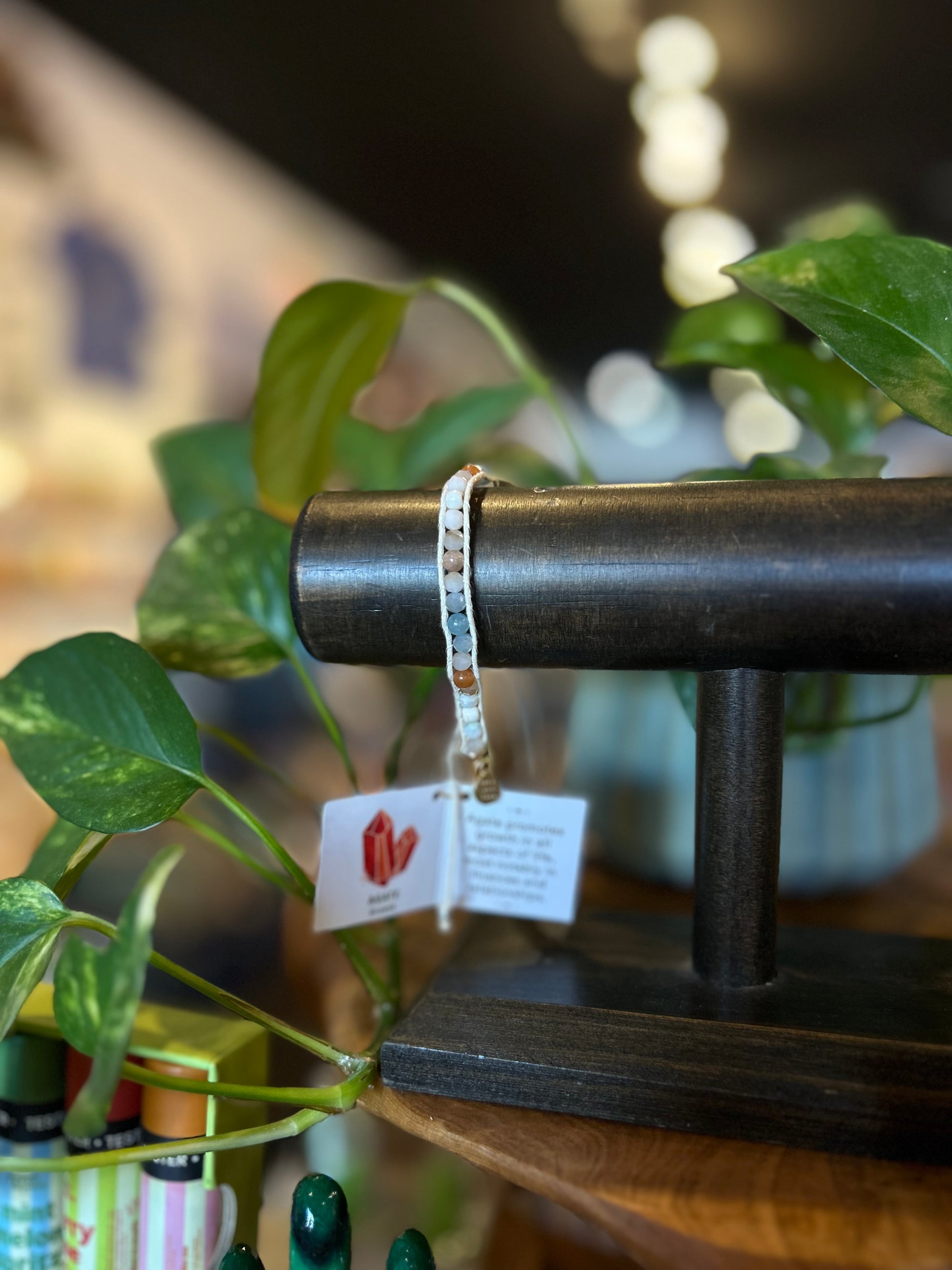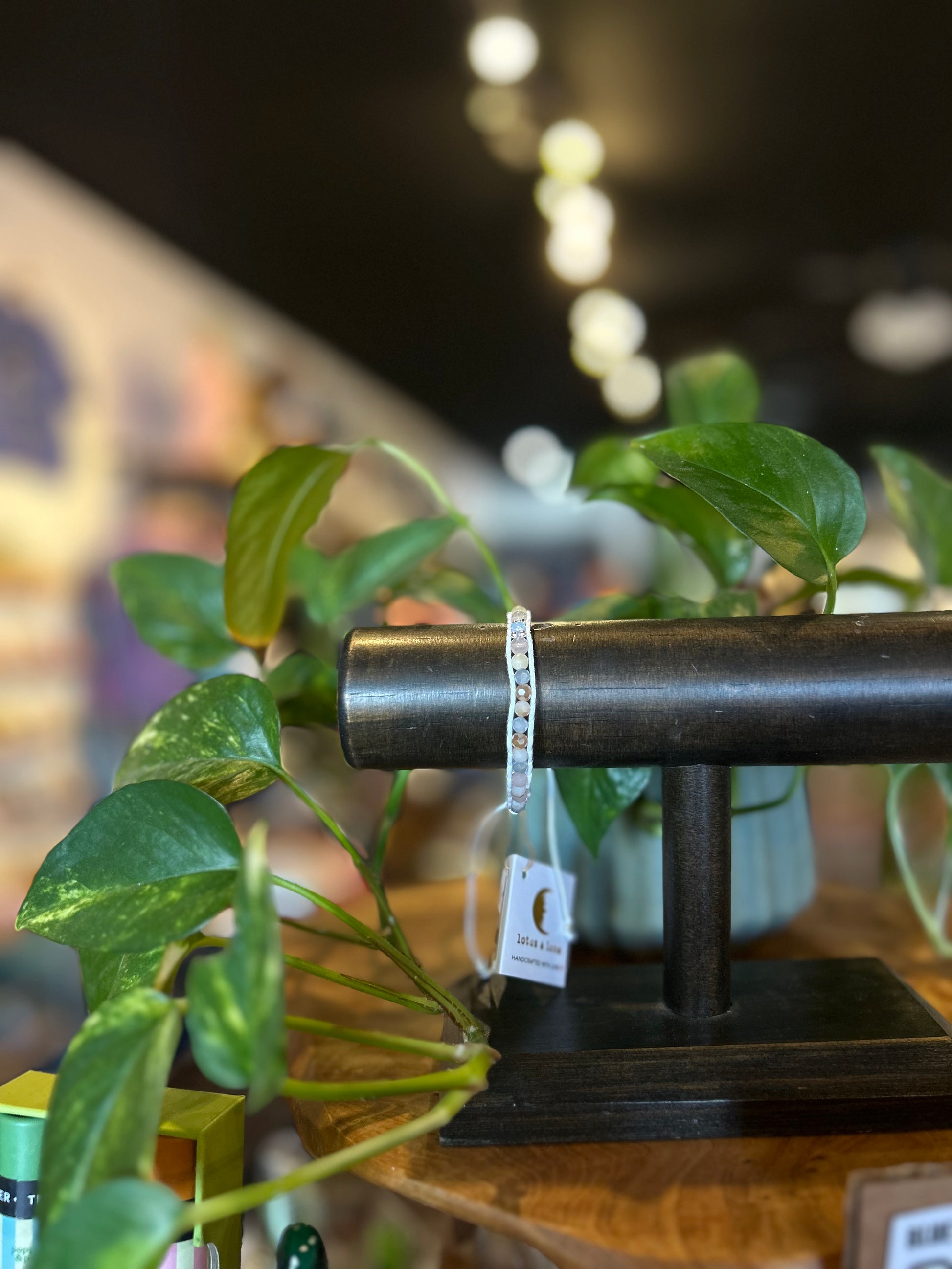 Inspired by the power and beauty of the moon, the Moonbeam collection offers moonstone in every piece. Known to heighten intuition and ease stress, everyone needs a little moonstone in their life! Please note that, due to their handcrafted nature, each bracelet is unique and may have slight variations.