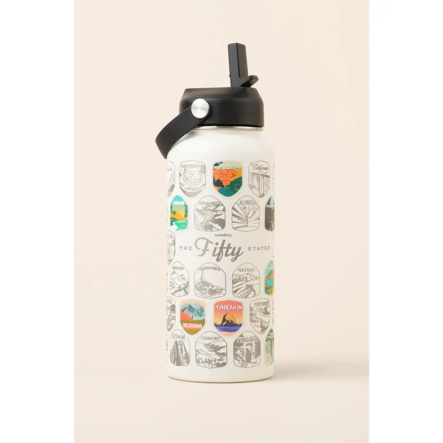 The Fifty States Bucket List Water Bottle is your adventure companion for exploring United States' diverse regions. Track your travels and celebrate each new visit with a uniquely illustrated, weather-proof sticker. Buckle up and rev your engine —your great American 50 states trip starts now!