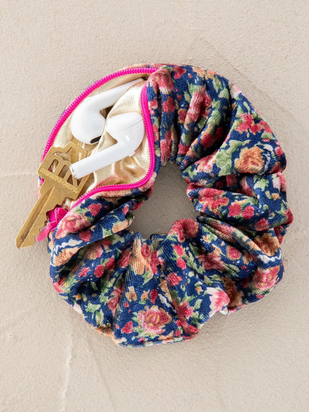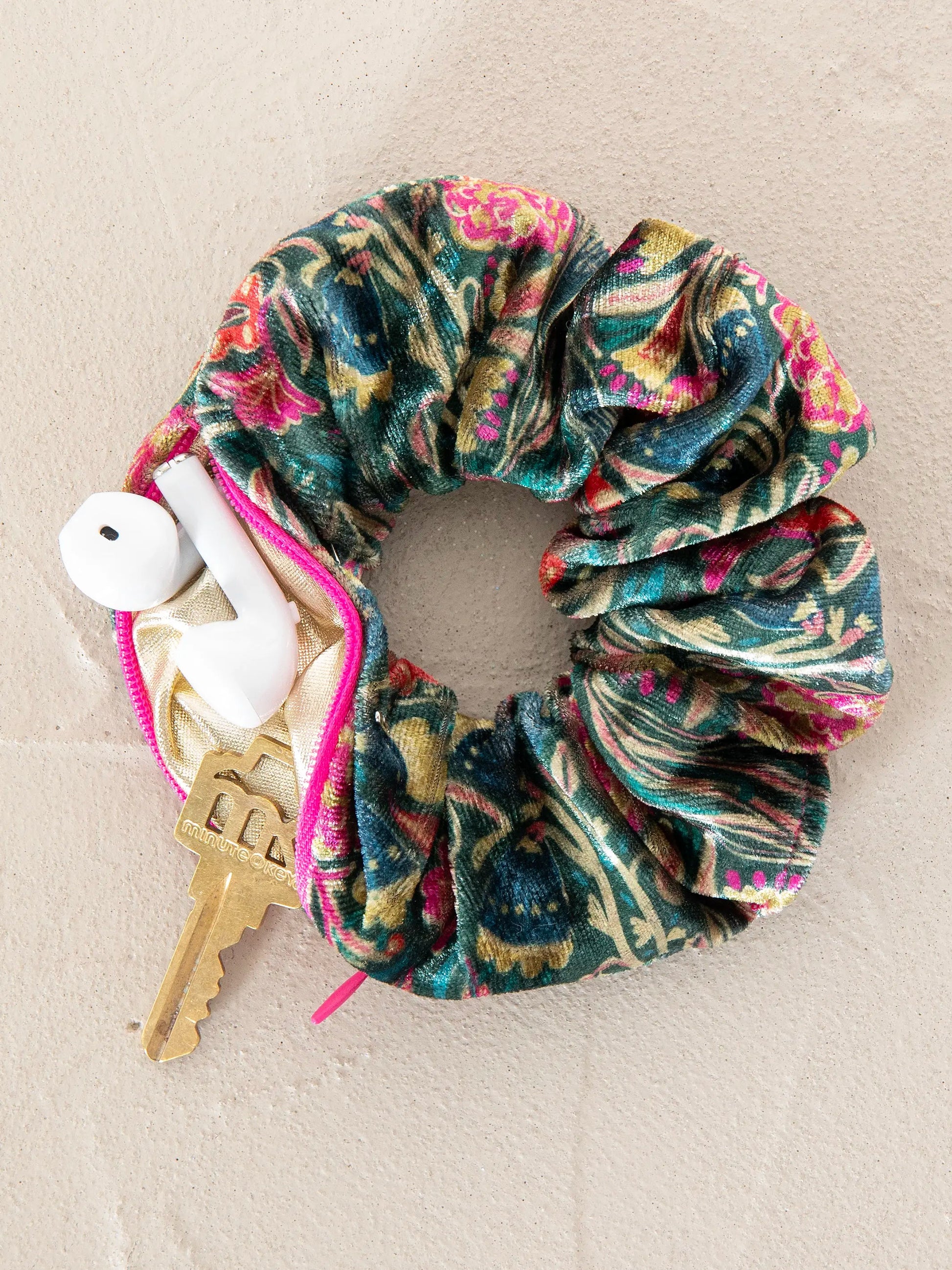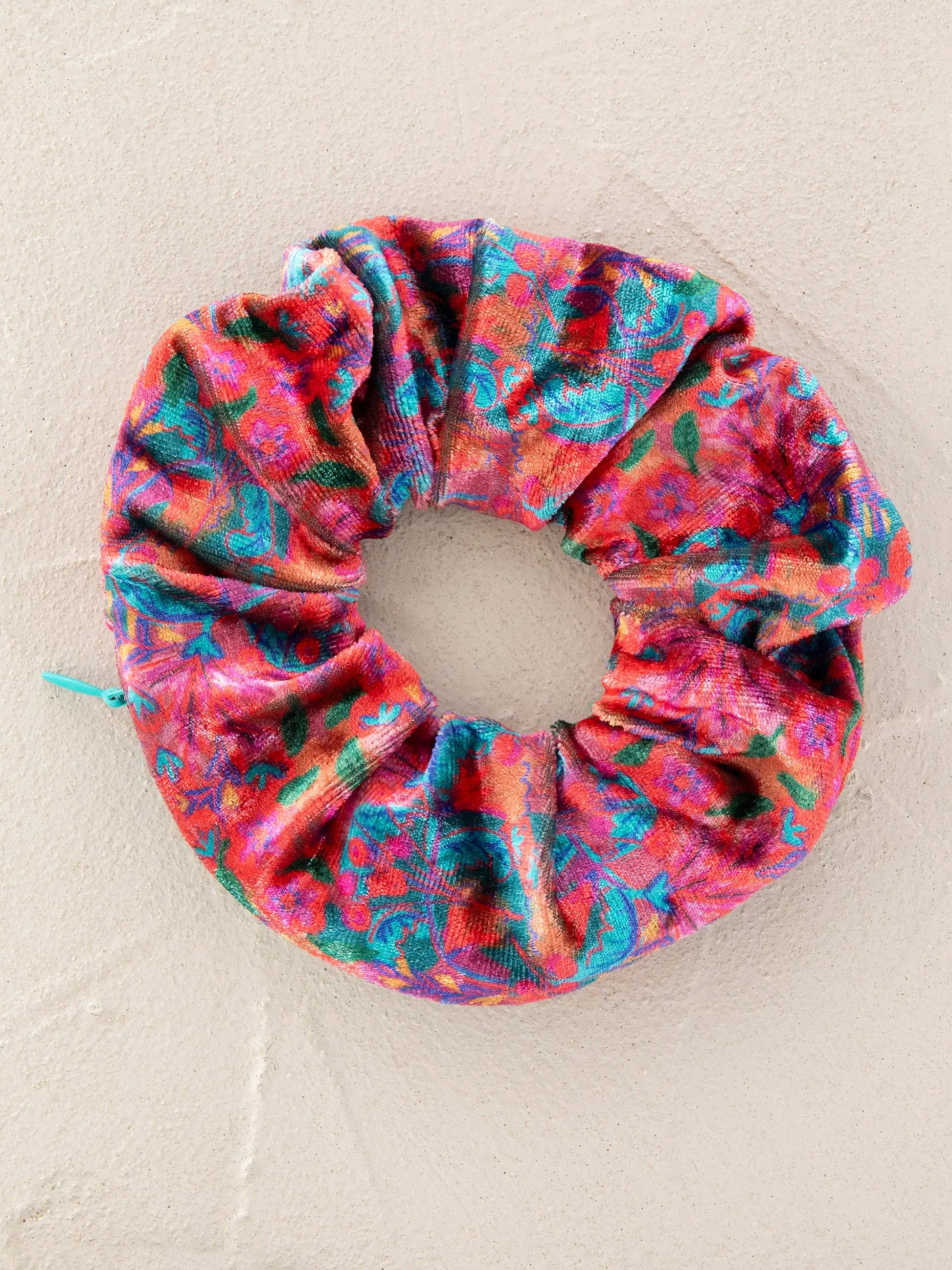 Elevate any ensemble with this charming velvet scrunchie featuring a playful pattern-and it's perfect for stashing your essentials on the move! Conceal your house key or tiny trinkets in this fully lined velvet scrunchie with a secret zipper.