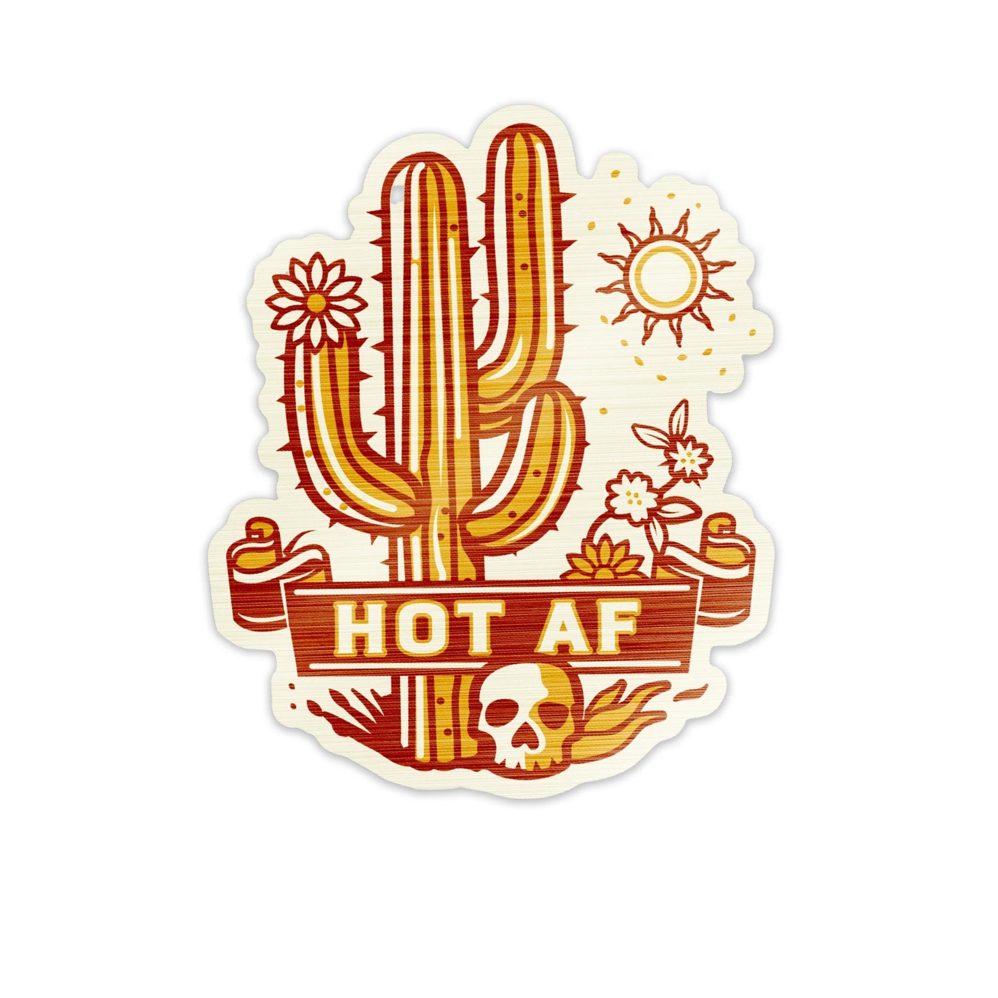Feel the heat and take risks with Hot AF Sticker! With a bold skull and saguaro design, this sticker packs a punch of wild energy. Put it on your skateboard and show the world you're not afraid to stand out. Be Hot AF!