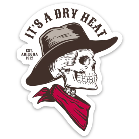 Anyone who's visited the great state of Arizona is familiar with this sentiment. Legend has it, if you say it often enough, the weather actually becomes more tolerable. Our cowboy skeleton friend think so, at least. Stick this wherever the heat waves...we think it'll look great on your water bottle, laptop, or car window.