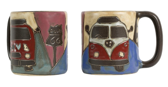 This 16oz Love Bus Stoneware Mug is expertly crafted with a southwest style, featuring hand-etched VW bus and Route 66 sign with a rustic finish. Its durable stoneware construction and glaze make it dishwasher and microwave safe and perfect for daily use. Enjoy a comforting cup of coffee in the desert with this eye-catching mug.