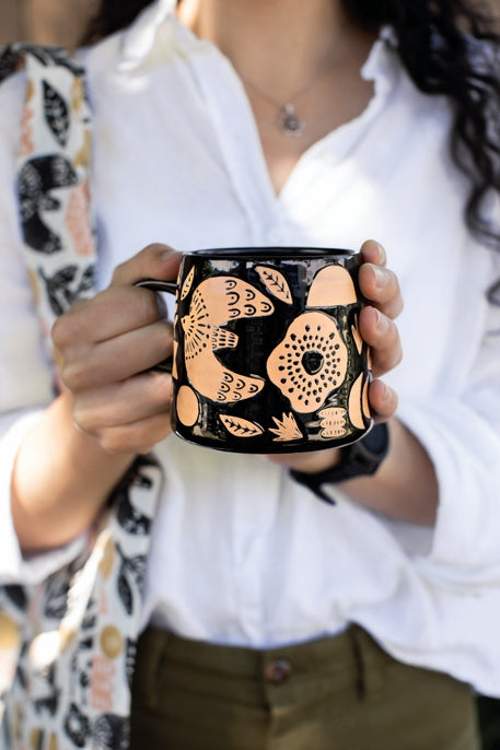Modernized Greco-Roman motifs and earthy bird, leaf and flower symbology impart a timeless feel to this Myth Imprint Mug by Danica Studio. With an organic shape, ribbed texture and engaging patterns, this is a mug that's both a joy to hold and behold. Wrap your hands around a steaming mug of your favorite hot beverage, and slowly savor the moment. Artisan-designed and geometrically inspired, these mugs feature captivating abstract patterns and easy-to-match neutral and pastel colors for an on-trend complement to your contemporary or modern table decor.