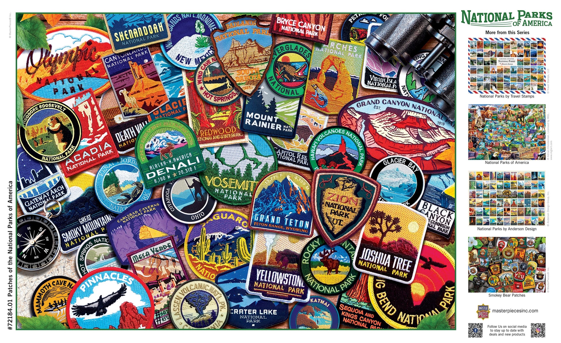 This Masterpieces 1000pc Puzzle of the National Parks of America features patches from all the National Parks, each with their own art and style. This fun collage lets you collect a souvenir from every park without ever leaving home! These puzzles are made on the highest quality 100% recycled puzzle board and packaged in sophisticated matte-finish display boxes.