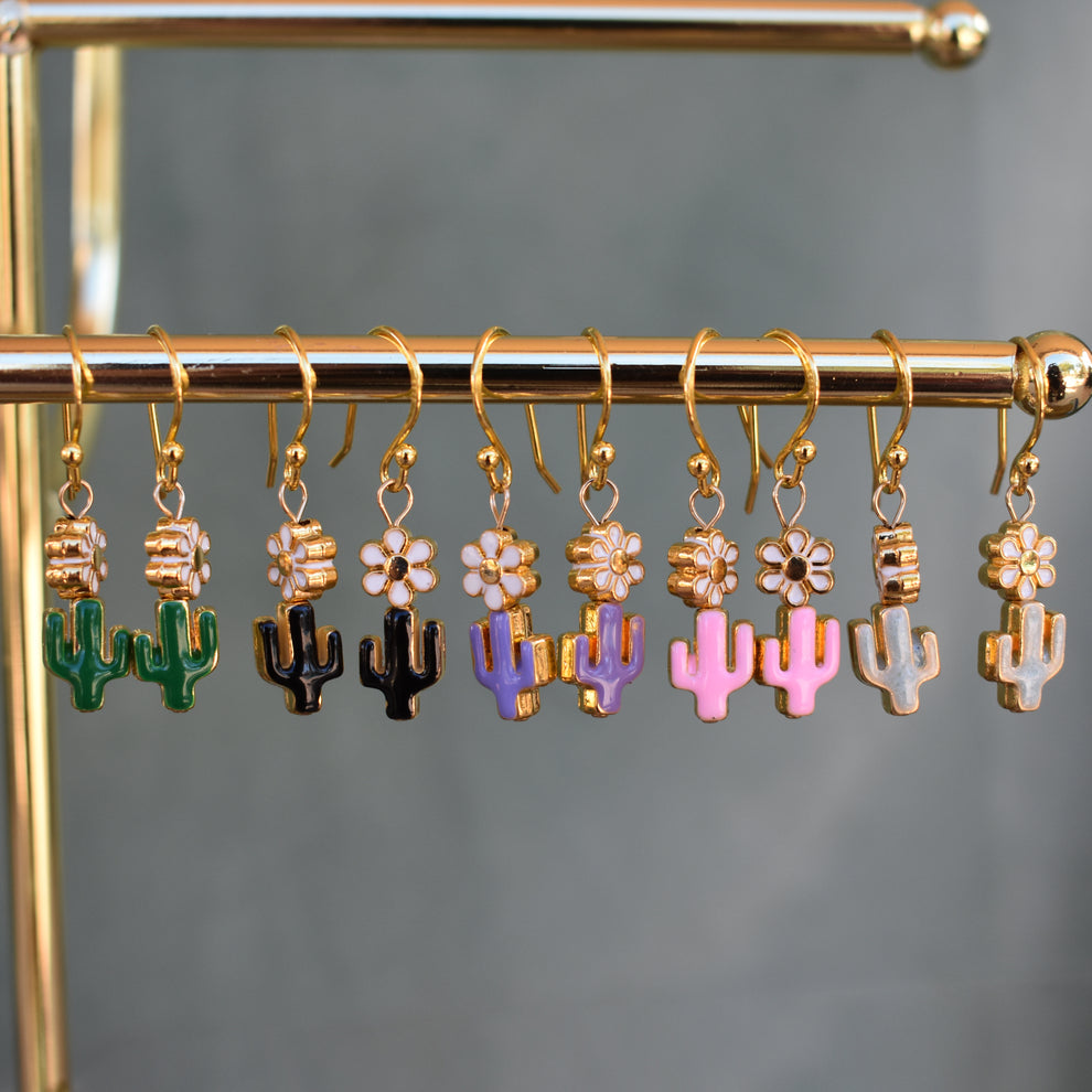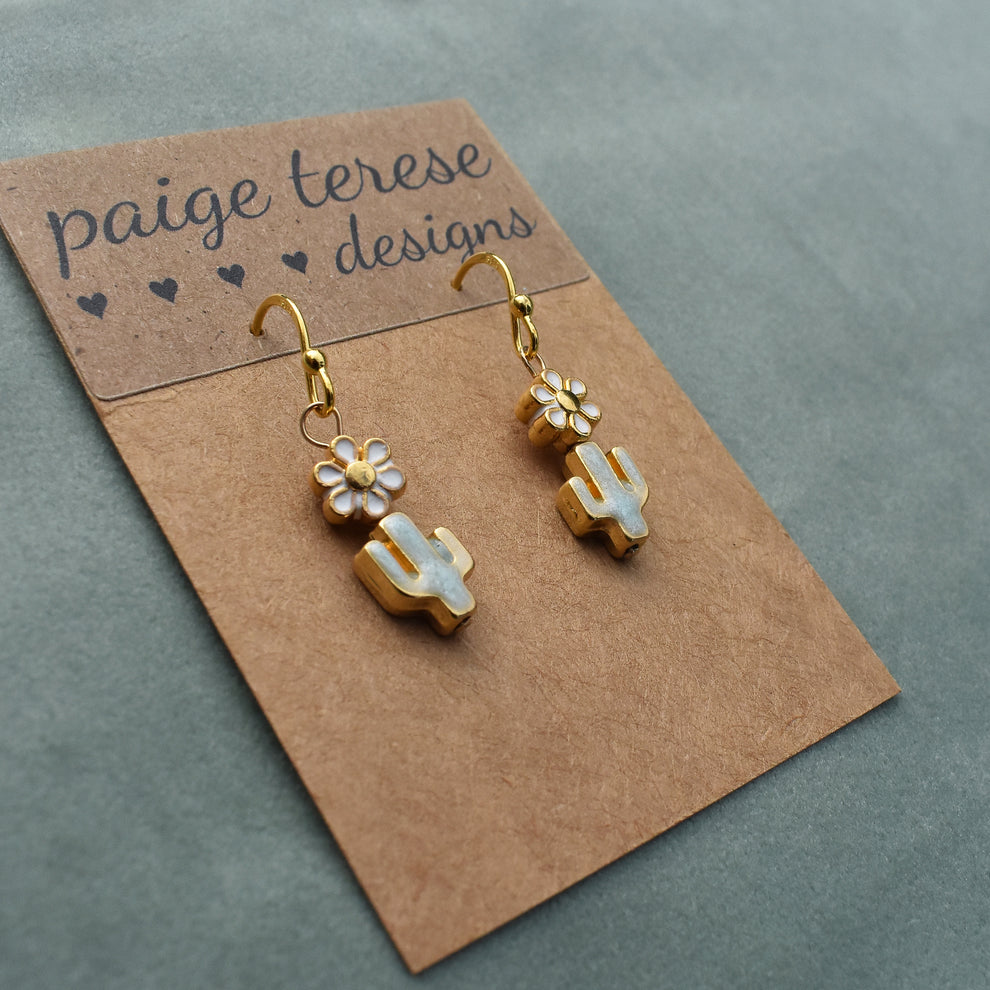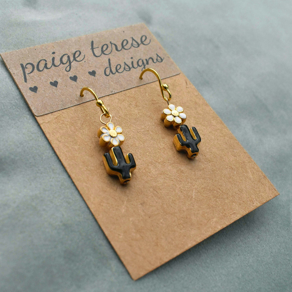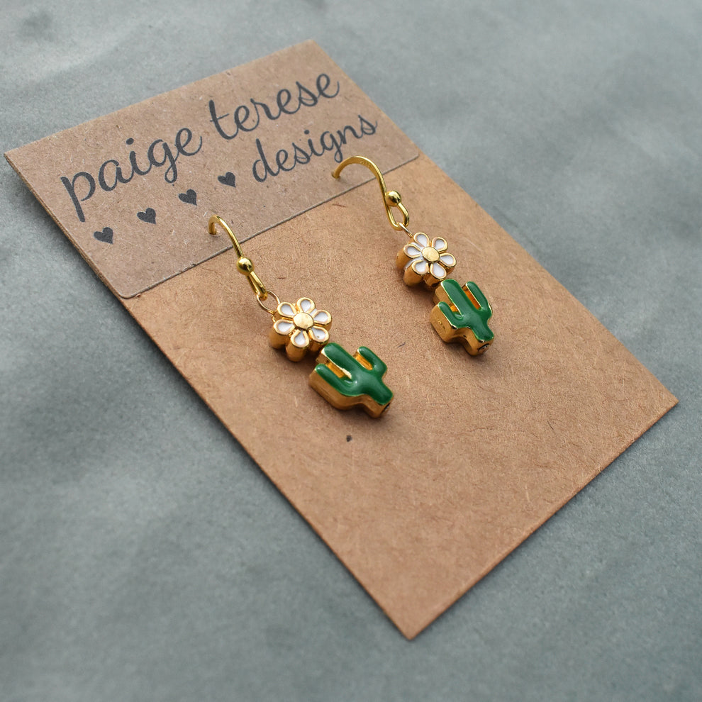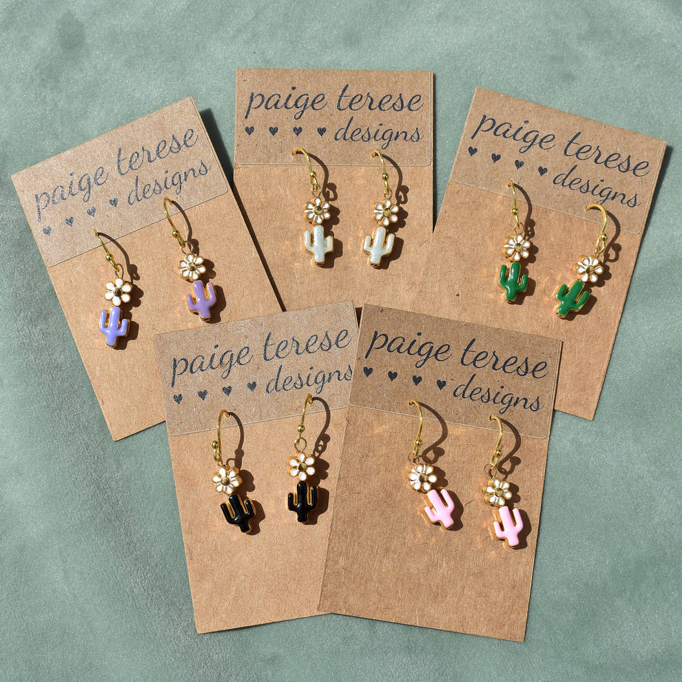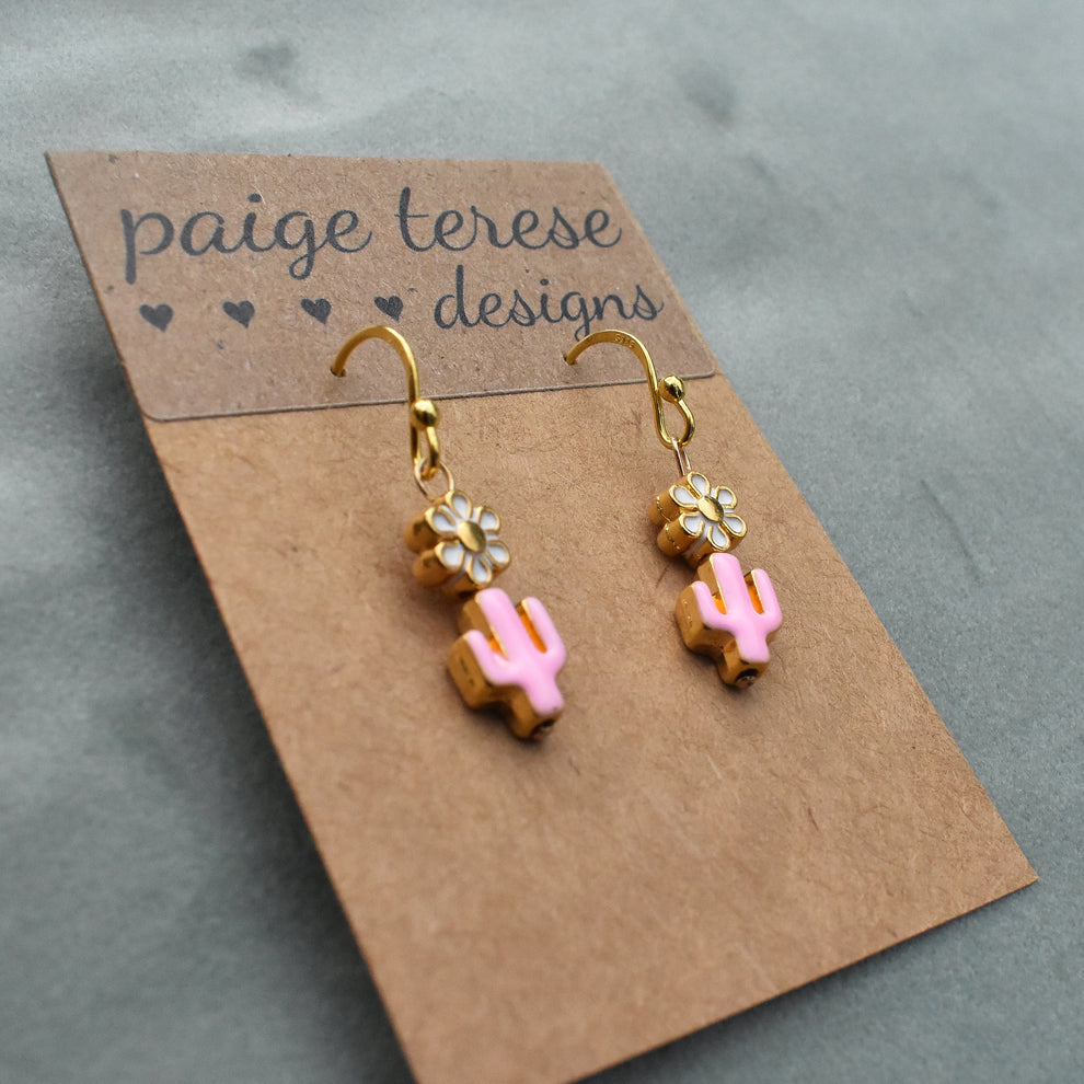 these dainty cactus flower earrings feature cacti topped with flower beads to mirror the beauty of blooming saguaros in arizona. showcase your love for the desert and choose from a variety of colors!