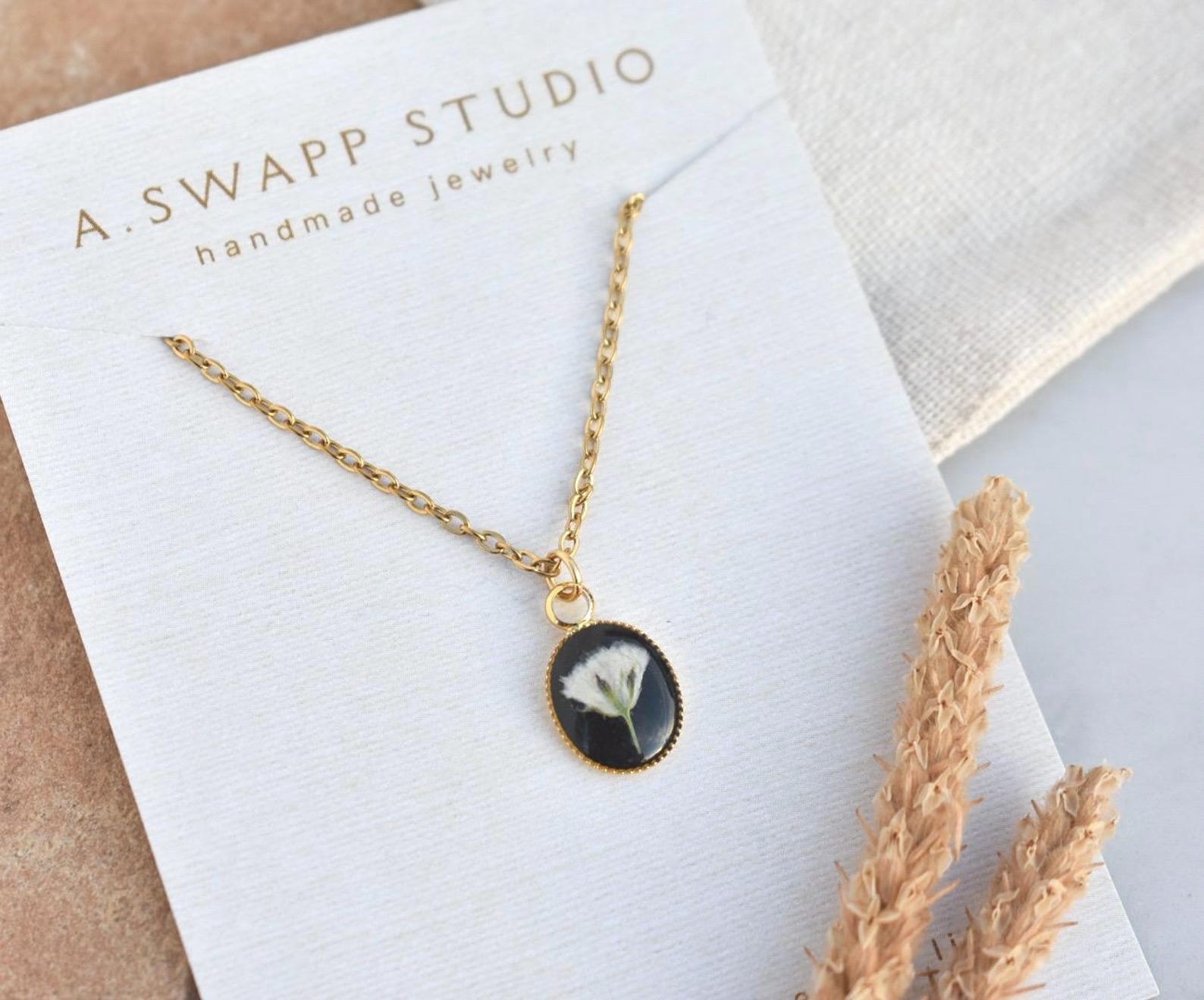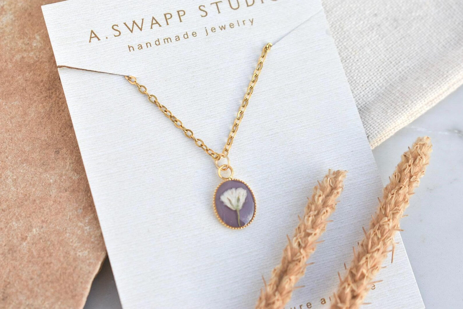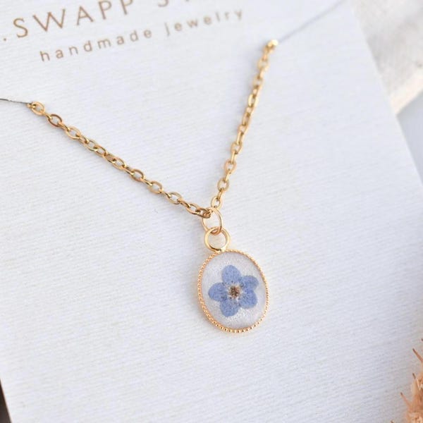 Dainty and colorful handmade resin necklaces, with real pressed flowers! We artfully place Baby’s Breath, Queen Anne's Lace, and Forget Me Not flowers into high quality resin jewelry for the perfect reminder of nature and its beauty.
