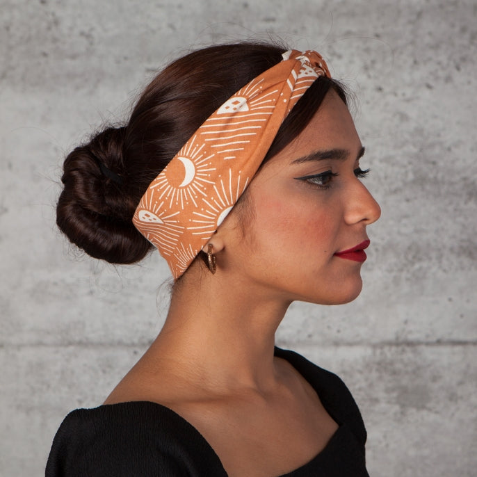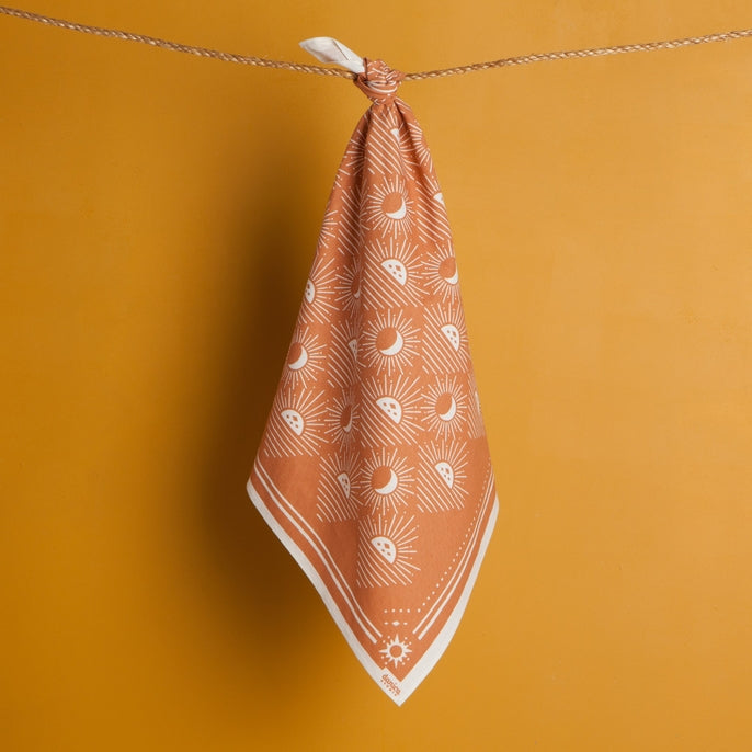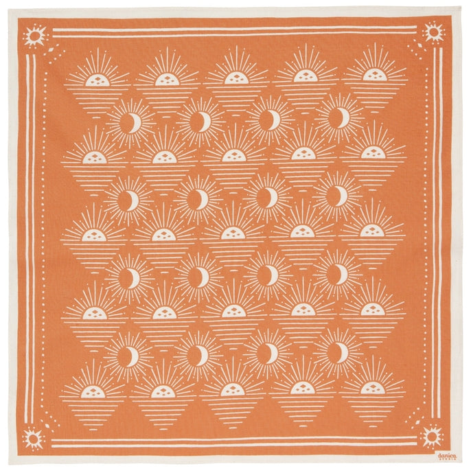 Ancient symbols transformed by contemporary wit embellish this bandana from the Danica Studio's Soleil collection. Artful imaginings from our talented team of Vancouver designers have been captured on these versatile bandanas, creating a range of delightfully singular unisex accessories. Featuring enchanting images inspired by everyday life, nature and beyond, our iconic designs meld the timeless sophistication of the 1950s with quirky, contemporary style.
