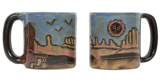 This 16oz Red Rock Stoneware Mug is expertly crafted with a southwest style, featuring a hand-etched desert scene and a rustic but colorful finish. Its durable stoneware construction and glaze make it dishwasher and microwave safe and perfect for daily use. Enjoy a comforting cup of coffee in the desert with this eye-catching mug.