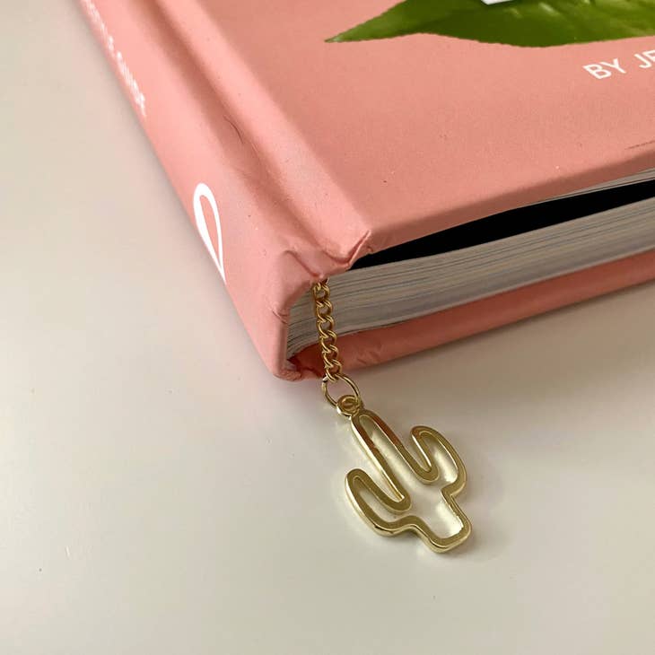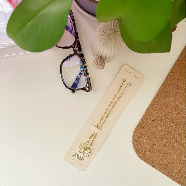 Never lose your spot in your latest read with this cute cactus chain bookmark! It comes with a rust-free, nickel-free gold chain, complete with a saguaro cactus charm on one side and a flower charm on the other. Made in Arizona.