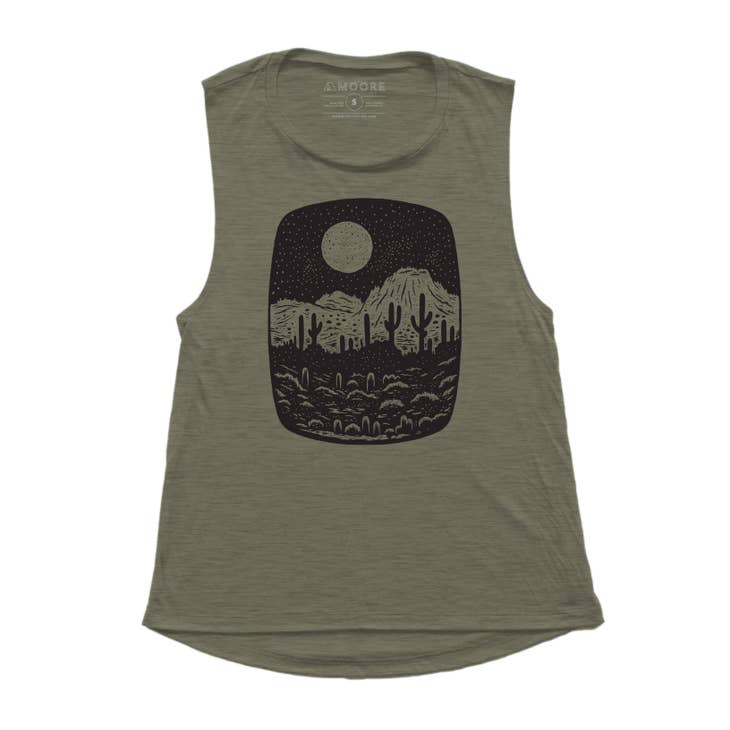 Experience the beauty and power of the desert night with the Night Butte Ladies Tank. An olive green soft ringspun cotton/poly blend, this go-to tank is screen printed with a stunning saguaro silhouette and full moon - designed to evoke deep emotions and make a statement. Dare to explore the unknown with style and confidence!