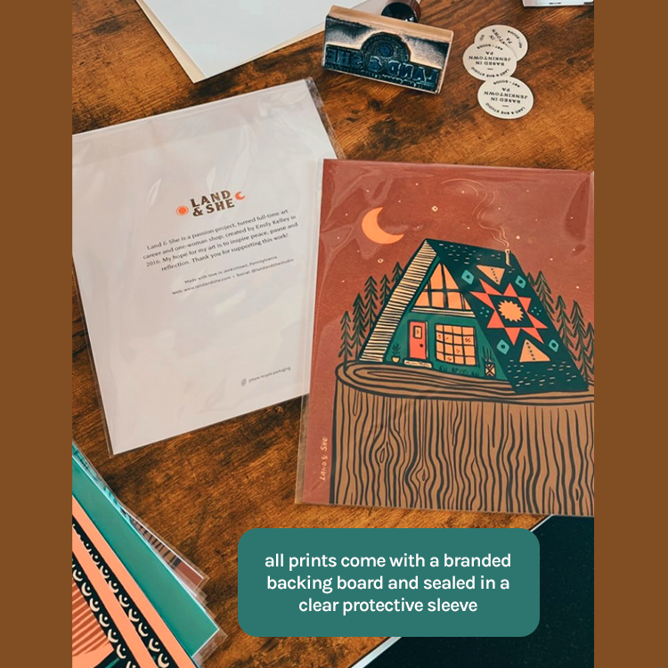 Land & She prints are made with nature in mind. All of my work is inspired by the outdoors and a sense of peace. My hope for this work is to inspire a moment of pause and reflection to whoever views or interacts with the artwork.