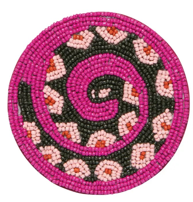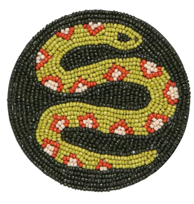 Danica Studio designs radiate from the surface of our hand-beaded coaster set from the Gardenland collection. With earthy greens, bold pops of pink and citron, these coasters give a magnified glimpse of slithering snakes in the garden. Crafted with dyed glass beads and a strong fabric core, these little beauties are made to last.