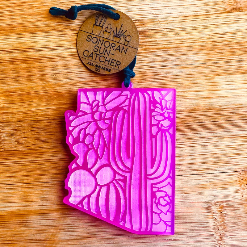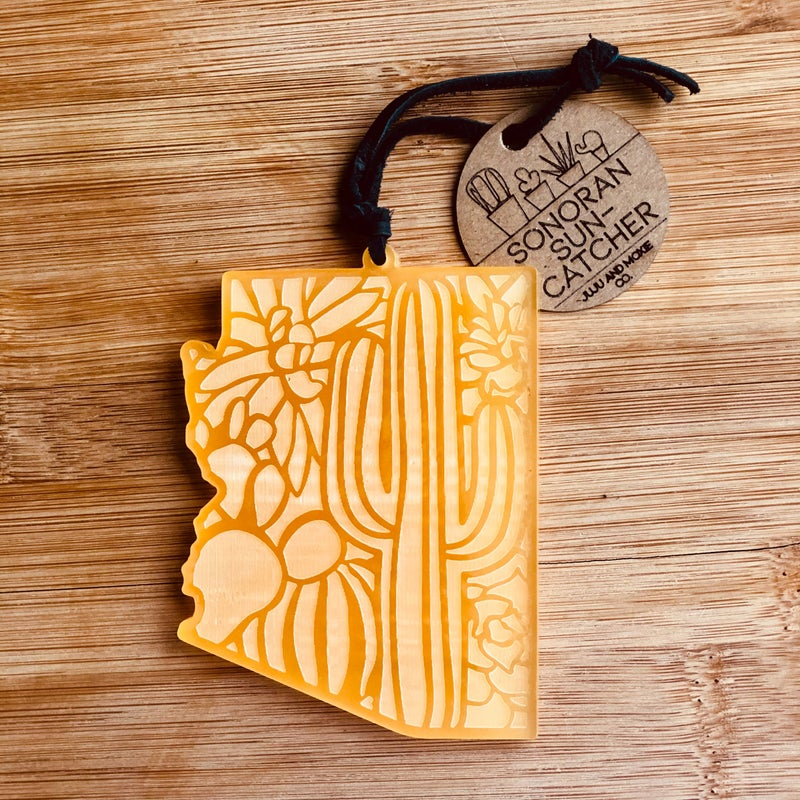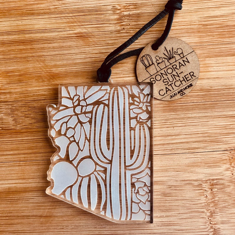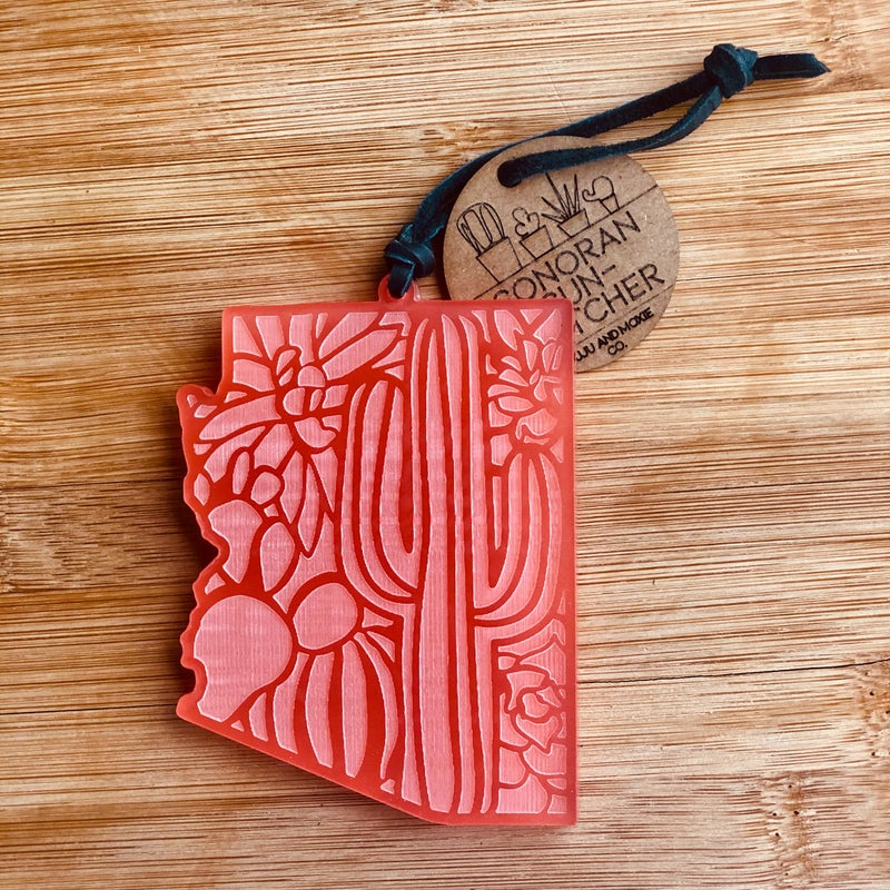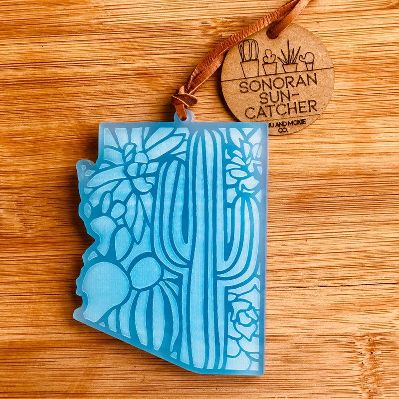 Our Sonoran Suncatchers are made of translucent bright acrylic and etched with a motif of succulents and cacti. They catch the sunshine beautifully, which is always in fashion living in the southwest. These are super popular as gifts to bring back home when visiting Arizona, and the color palette they come in makes it difficult to choose just one.