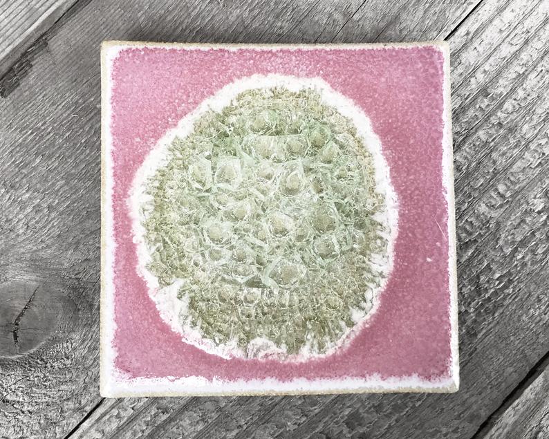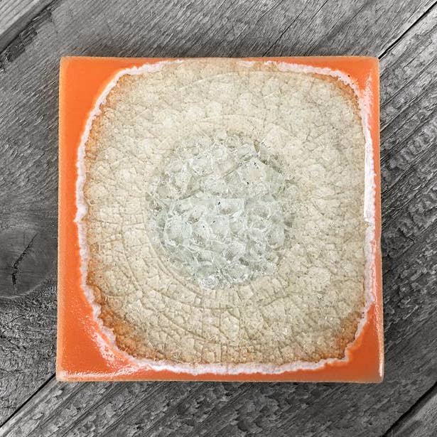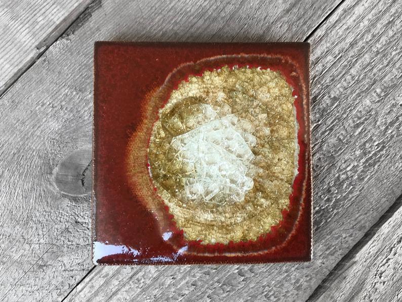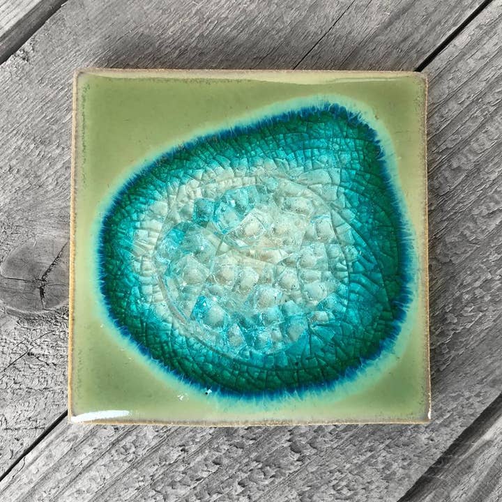 Feel the unique complexity of nature when you experience this artisanal stoneware and glass coaster. Crafted with a crackled surface, vibrant colored glaze, and a beautiful geode-inspired design, this coaster is sure to bring an organic, eye-catching touch to your living space. Different with each piece due to variations in the glaze and stoneware, this coaster will be a one-of-a-kind addition to any décor.