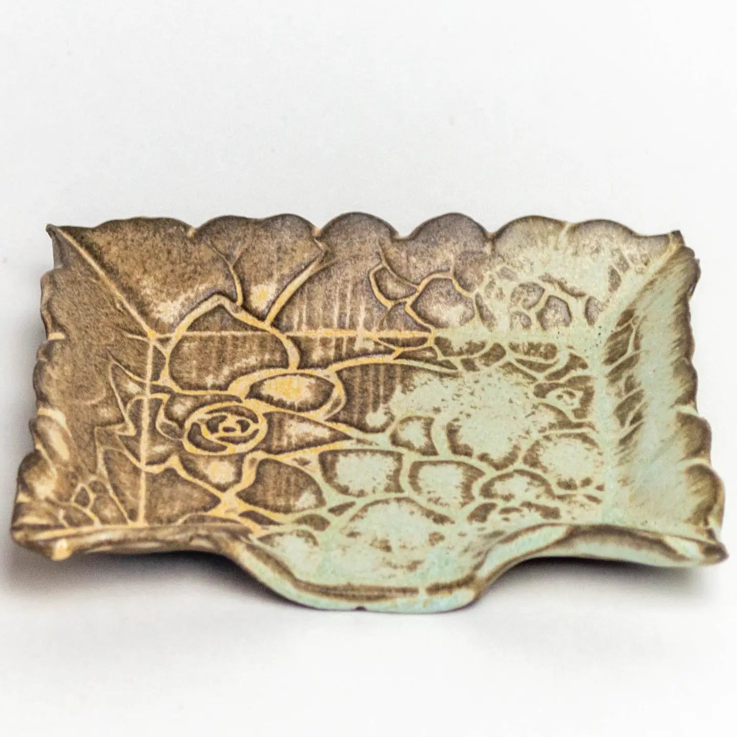 This beautiful chocolate clay succulent pattern soap dish is hand-built and hand-glazed in Oberlin, Ohio!!