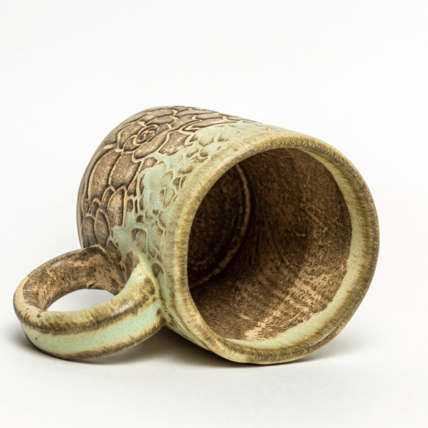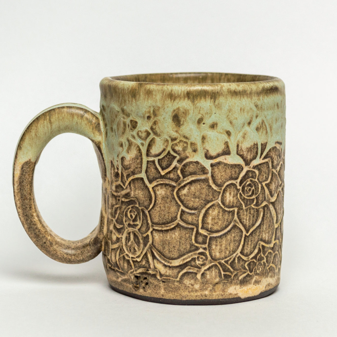 Sip in style with this beautiful chocolate clay mug featuring a charming succulent pattern! Handmade and hand-glazed with care in Oberlin, Ohio, this delightful stoneware mug holds approximately 12 oz.—perfect for coffee, tea, or your favorite cozy beverage. Measuring about 3 1/4 inches wide and 4 inches high, it’s food, dishwasher, and microwave safe for everyday convenience. Each mug is uniquely crafted, so no two are ever exactly the same, with lovely variations in color and detail. A perfect blend of earthy elegance and handmade artistry for your mug collection!