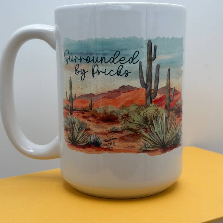 Step into the desert life with this mug featuring a desert landscape and the clever phrase "Surrounded By Pricks"! A must-have for any Arizona fan!