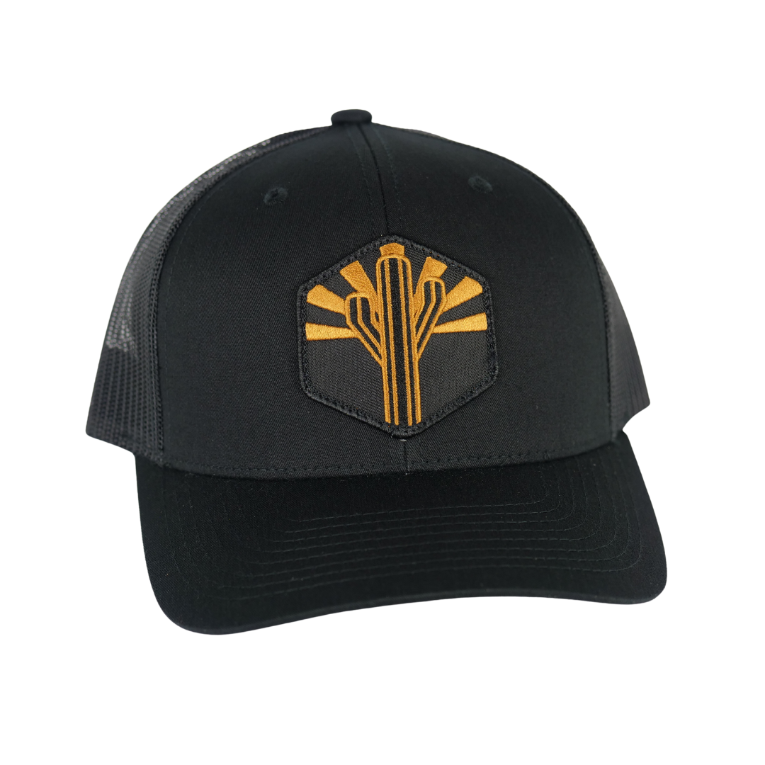 The Sentinel celebrates the Sentinel of the Desert, the Saguaro Cactus. Simple and stylish in a copper and black color combo with the iconic AZ state flag rays behind it.
