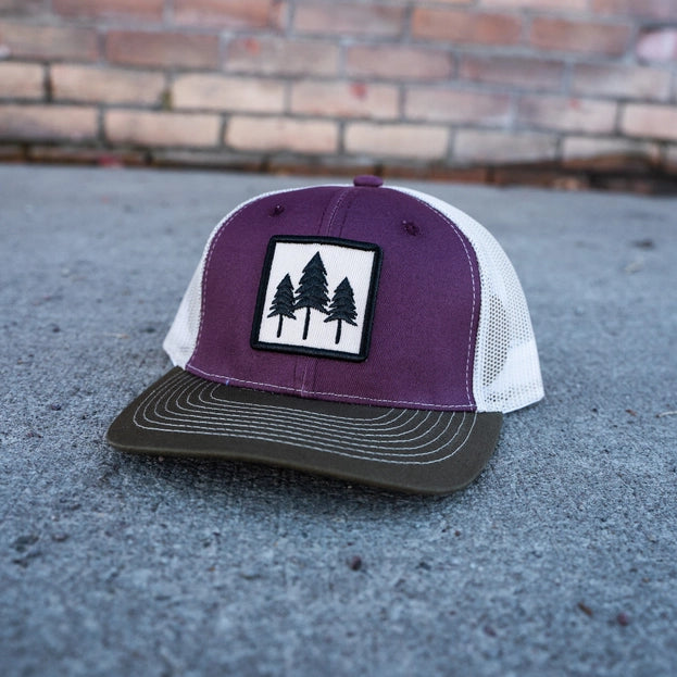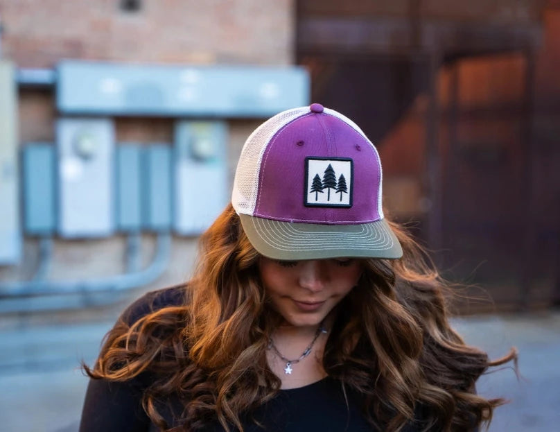 Add a pop of color to your wardrobe with our Three Tree Tri Tone Trucker. The purple trucker hat features three pine trees, perfect for showing off your love for nature. Stay stylish and support the environment with this unique hat.