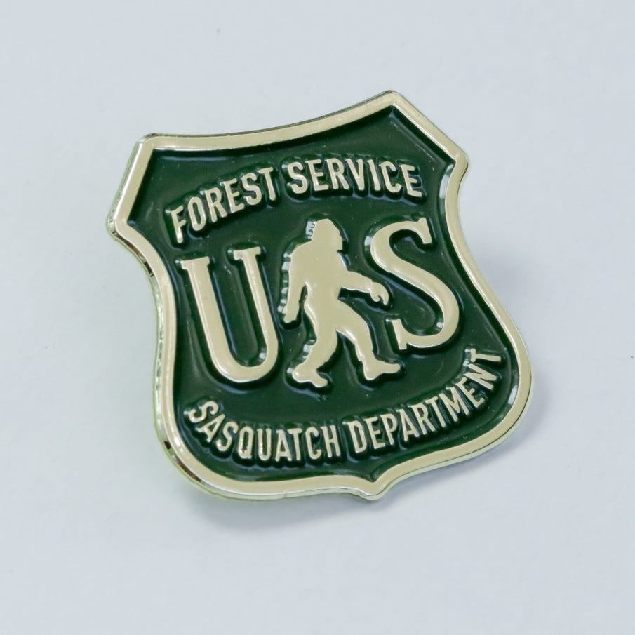 1" X 1" US Forest Service, Sasquatch Department, Enamel Lapel Pin The US Forest Service enamel pin with "Sasquatch Department" written on the bottom is a fun and unique way to show your support for the US Forest Service and its mission of protecting America's forests and natural resources. The pin features the iconic US Forest Service shield logo in a high-quality enamel finish, with the words "Sasquatch Department" written in small font along the bottom. The pin is made brass plated, with green enamel, and features a sturdy rubber clutch back to keep it securely fastened to your clothing or accessories. At approximately 1" inch in size, this enamel pin is the perfect size to add to a backpack, jacket, or hat.