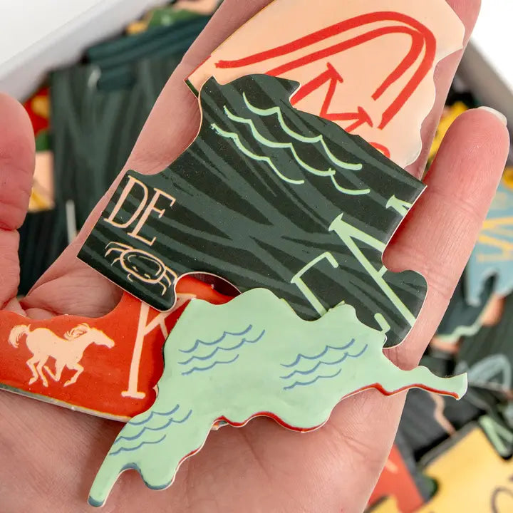 Explore the United States of America with our one-of-a-kind, hand-painted puzzle. The uniquely state-shaped pieces and beautifully illustrated designs make this puzzle a fun and educational activity for kids and adults alike. With only 110 pieces, it's the perfect gift for children and a great addition to any teacher's classroom.