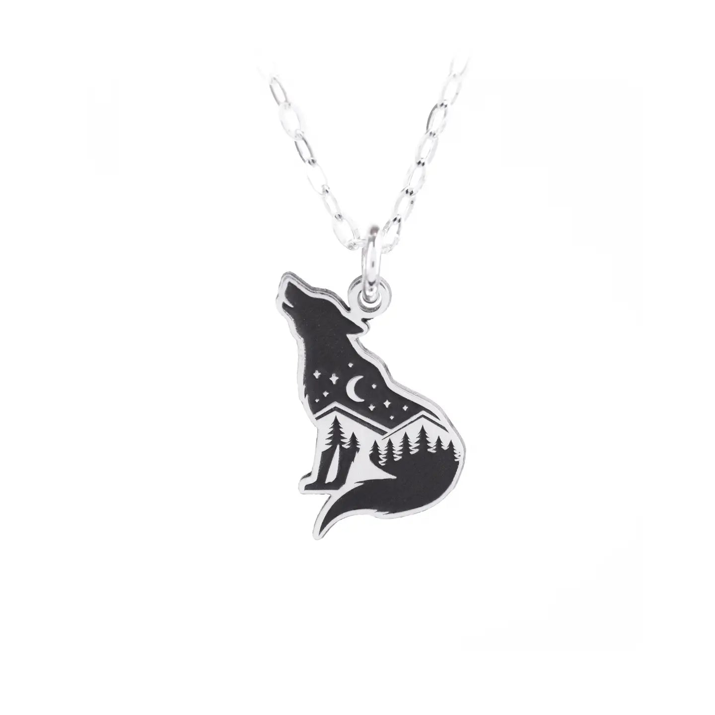 A mountain scene in the shape a wolf. Delicate and dainty sterling silver pendant hung from a sterling silver chain.